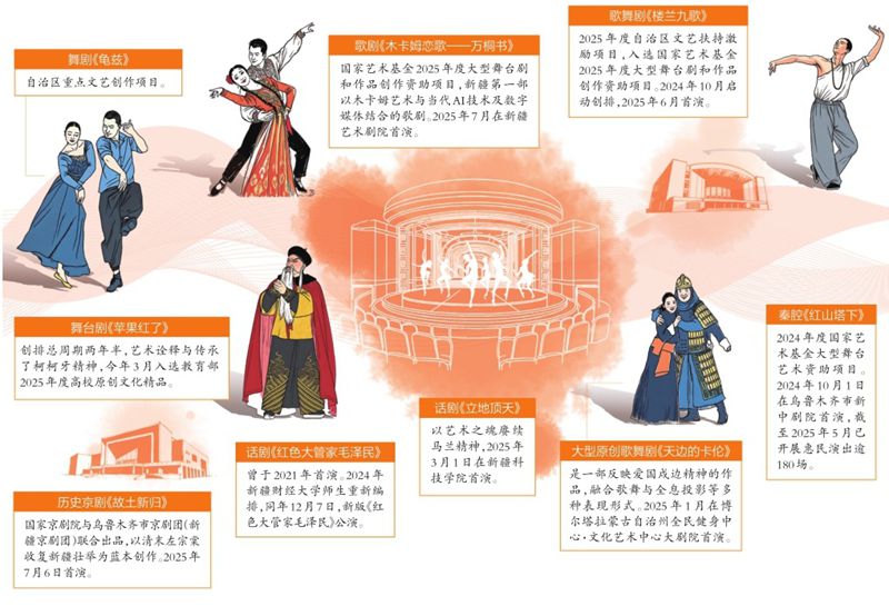 近年来,新疆文艺舞台生机勃勃,《故土新归》《红色大管家毛泽民》《我叫王成帮》《苹果红了》《屯垦戍边——天山脚下的誓言》等一批讲述新疆历史、文化和时代精神的作品,活跃在各级舞台上。
