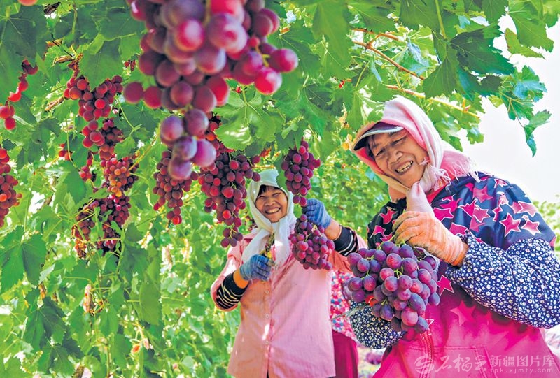 9月27日,昌吉市三工镇二工村村民在葡萄种植基地采摘葡萄。眼下,昌吉市各乡镇种植的葡萄迎来丰收,种植户加紧采收,供应市场。