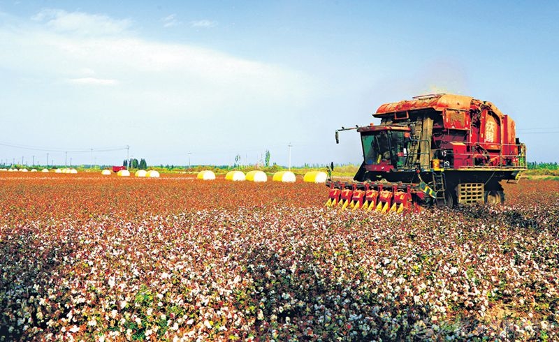 9月28日,采棉机在阿瓦提县塔木托格拉克镇托万克塔木托格拉克村棉田采收新棉。眼下,该县种植的144.98万亩棉花陆续进入采收期。