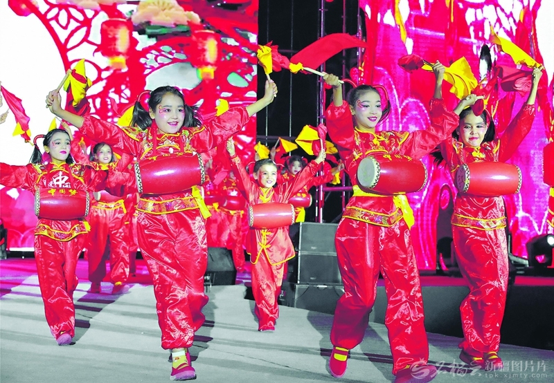 10月1日,洛浦县举办“辉煌70年·奋进新征程”暨“贺国庆·迎中秋”大型文艺晚会。图为孩子们在表演腰鼓。买买提艾力·艾尼瓦尔摄