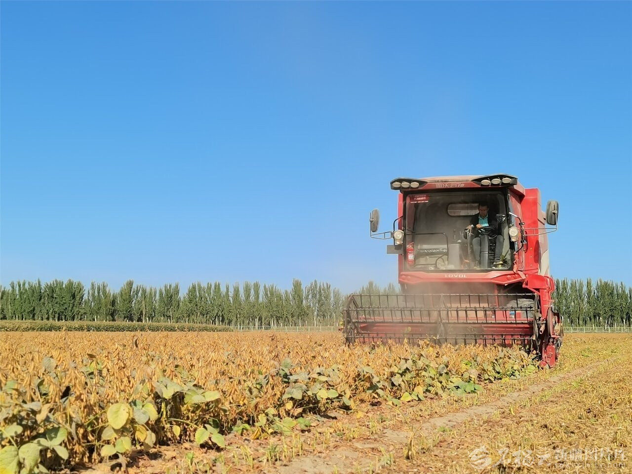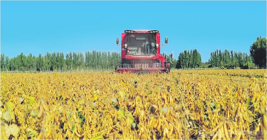 大型机械在新疆大豆育种家泽普基地收获大豆(10月10日摄)。这两日,自治区农业科学院作物研究所国家大豆产业技术体系南疆综合试验站组织专家在该基地对中黄30与专门为南疆培育的合农138大豆品种进行了测产,两个品种亩产均突破300公斤。王华贤摄
