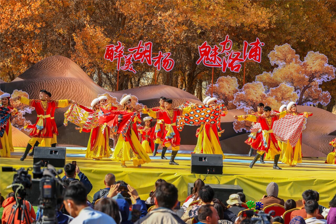 10月18日,新疆和田地区洛浦县第五届“醉美胡杨 魅力洛浦”胡杨季观赏活动在杭桂镇洛滨胡杨林正式启动。当日,来自各地的1万余名游客齐聚于此,在欣赏精彩文艺演出的同时,沉浸式感受胡杨林的秋日魅力。(通讯员:买买提艾力·艾尼瓦尔)