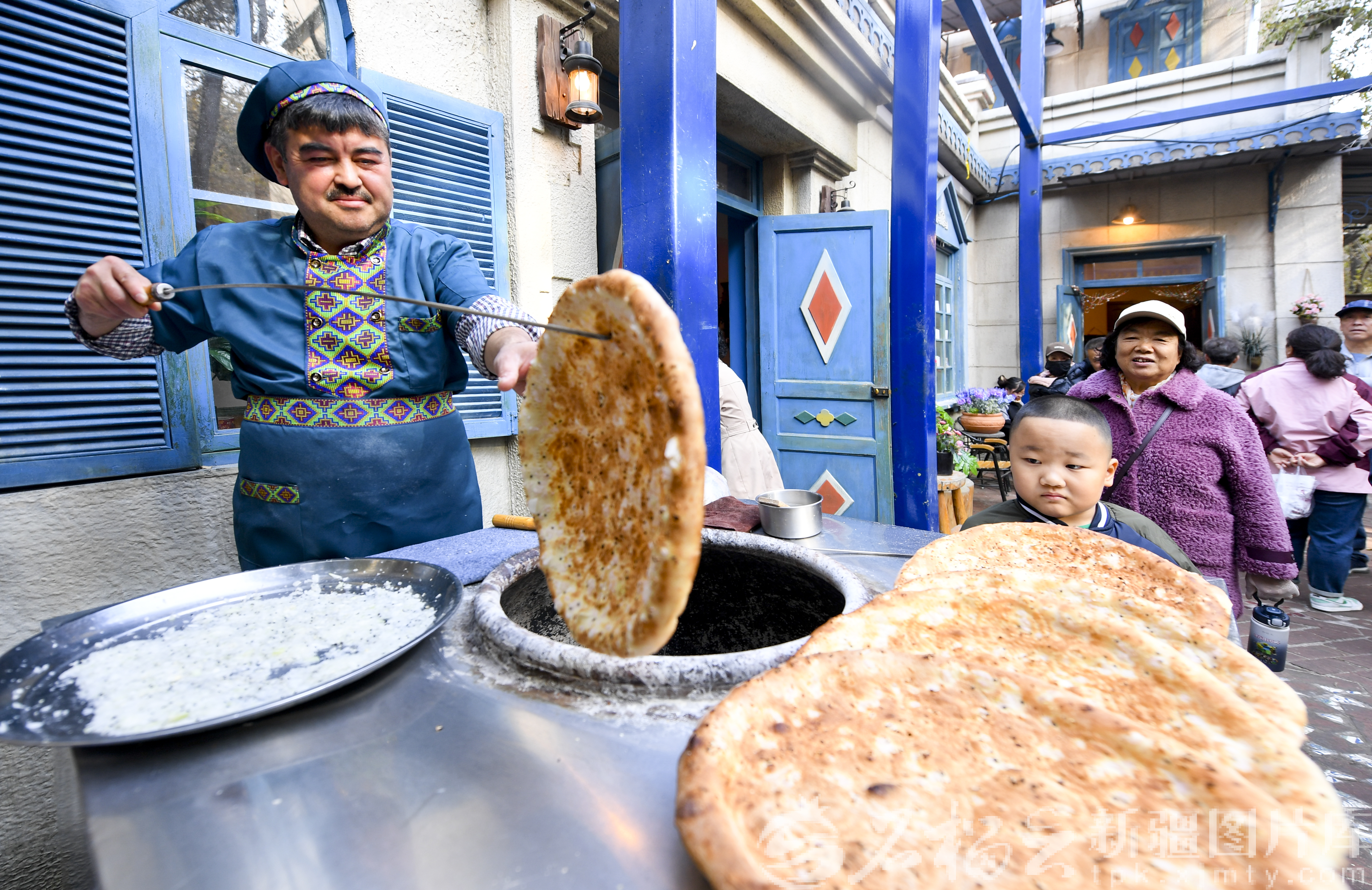11月2日,面点师傅在《红石榴餐厅》的小院里打馕。
