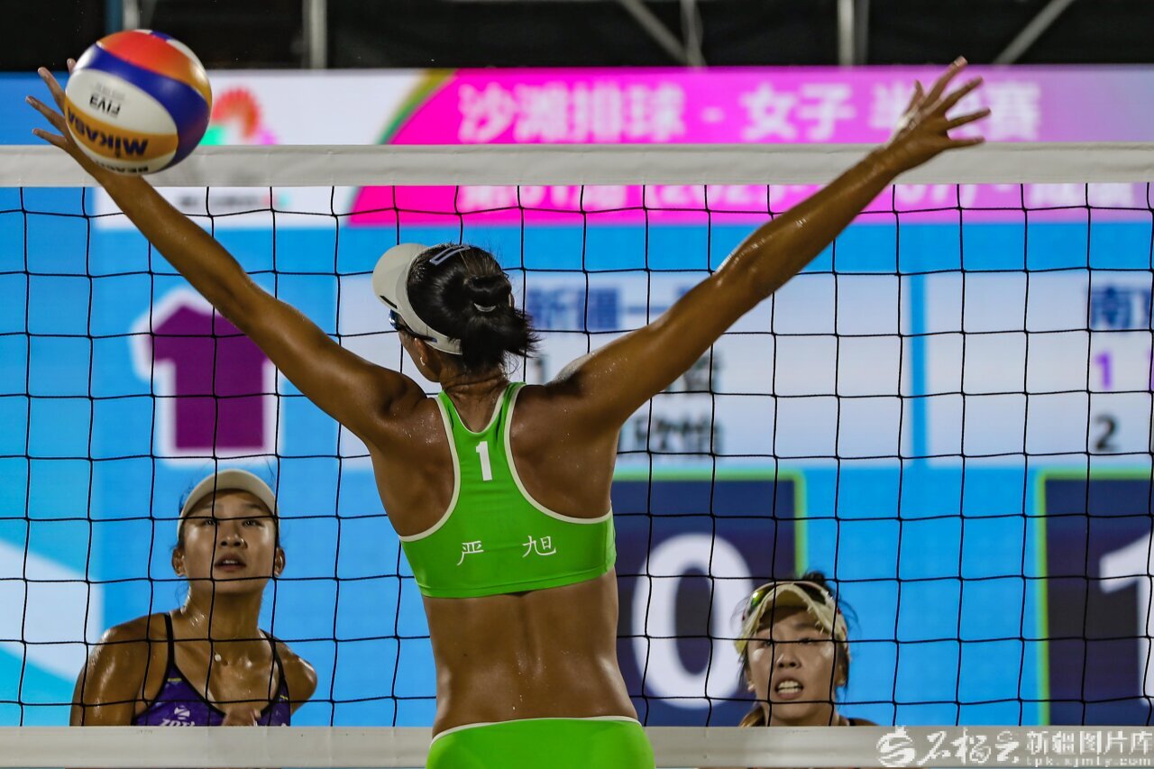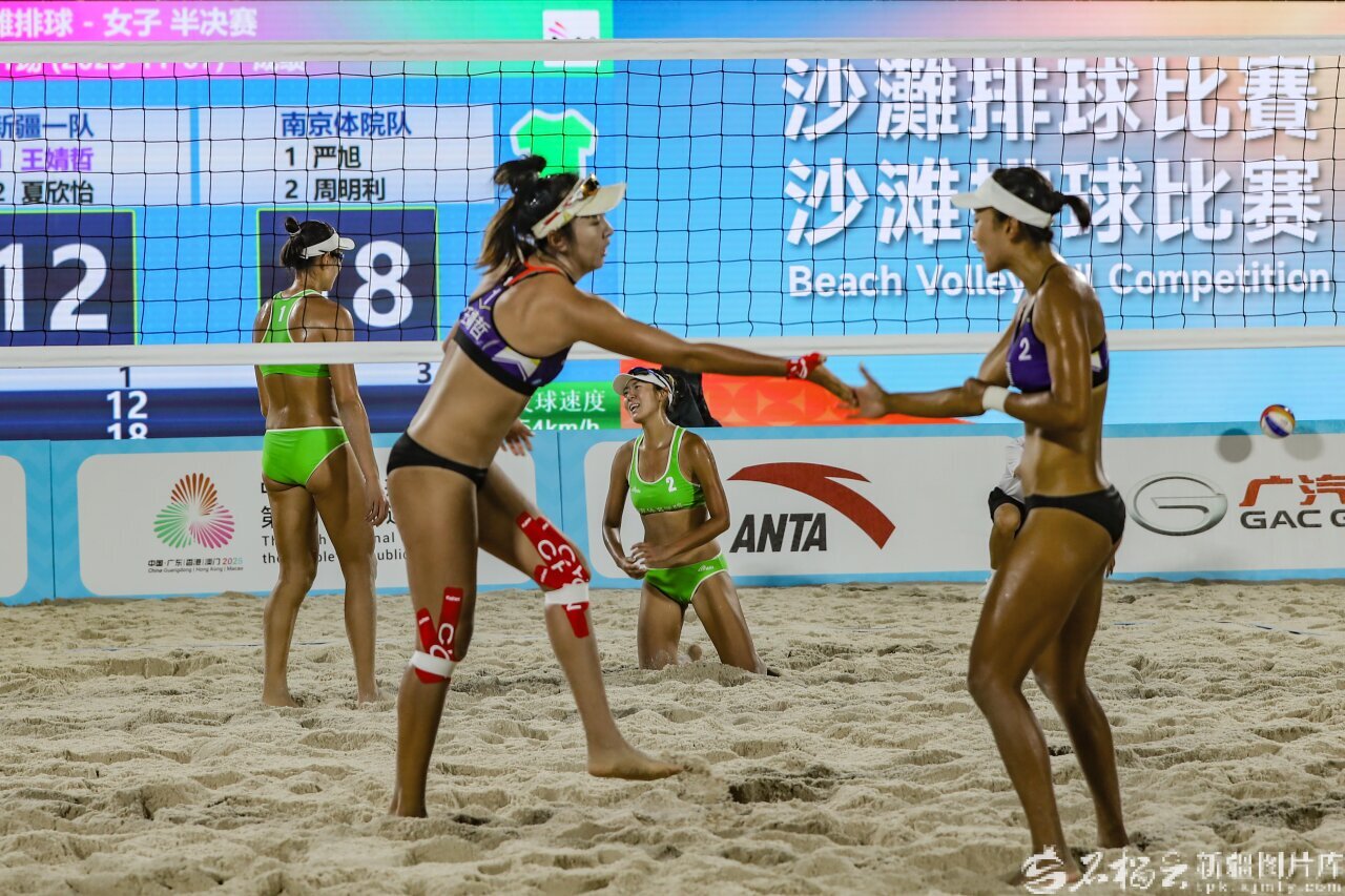 11月7日,第十五届全国运动会沙滩排球女子项目半决赛新疆一队的王婧哲/夏欣怡组合对阵南京体院队新秀严旭/周明利组合。