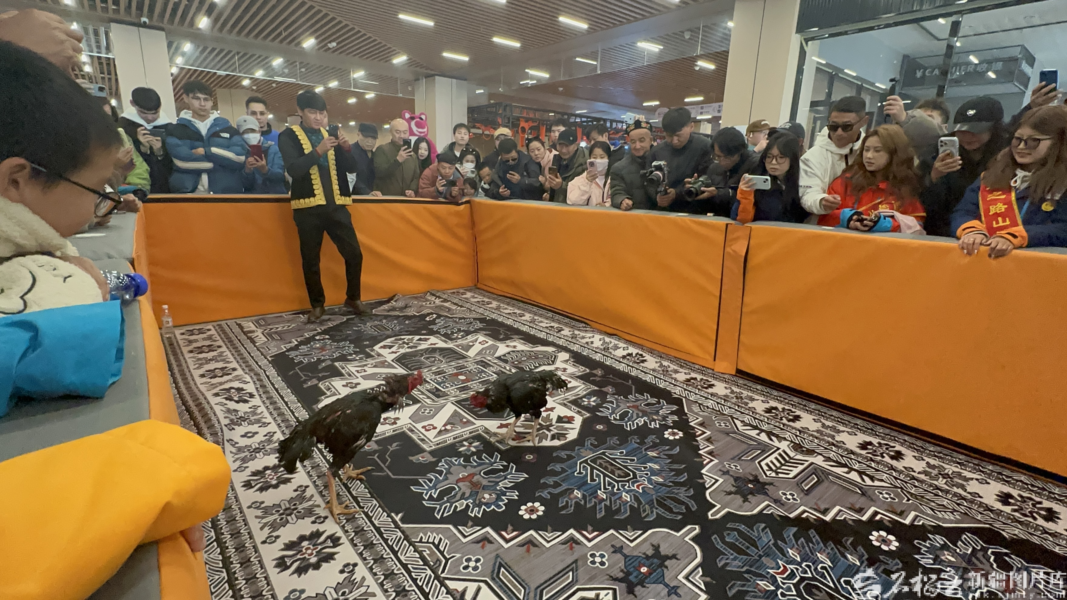 精彩的斗鸡表演吸引着雪友们的目光。庄红摄
