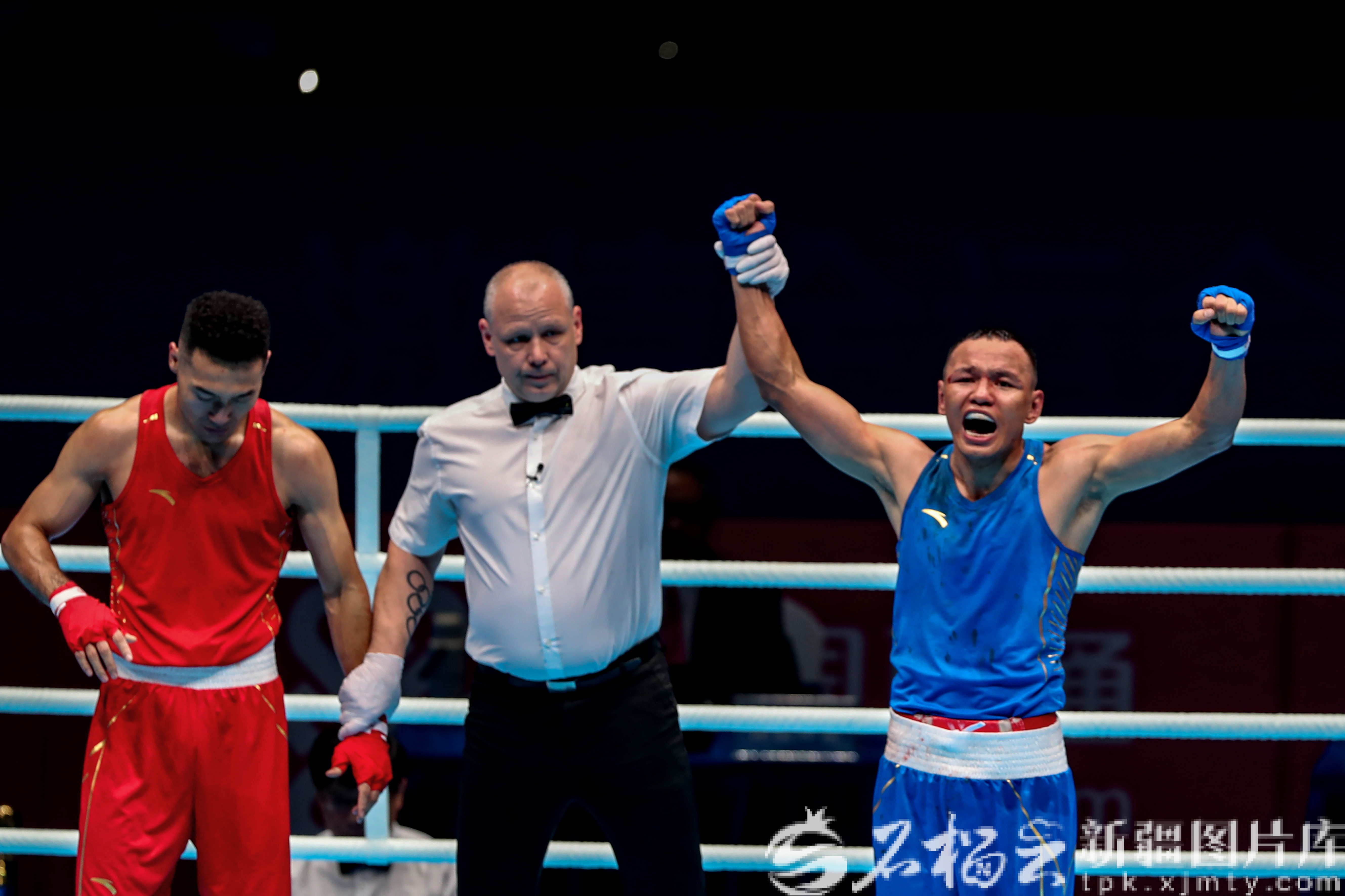 11月13日,新疆拳击队运动员叶尔达吾列提·买依兰别克胜出夺金。