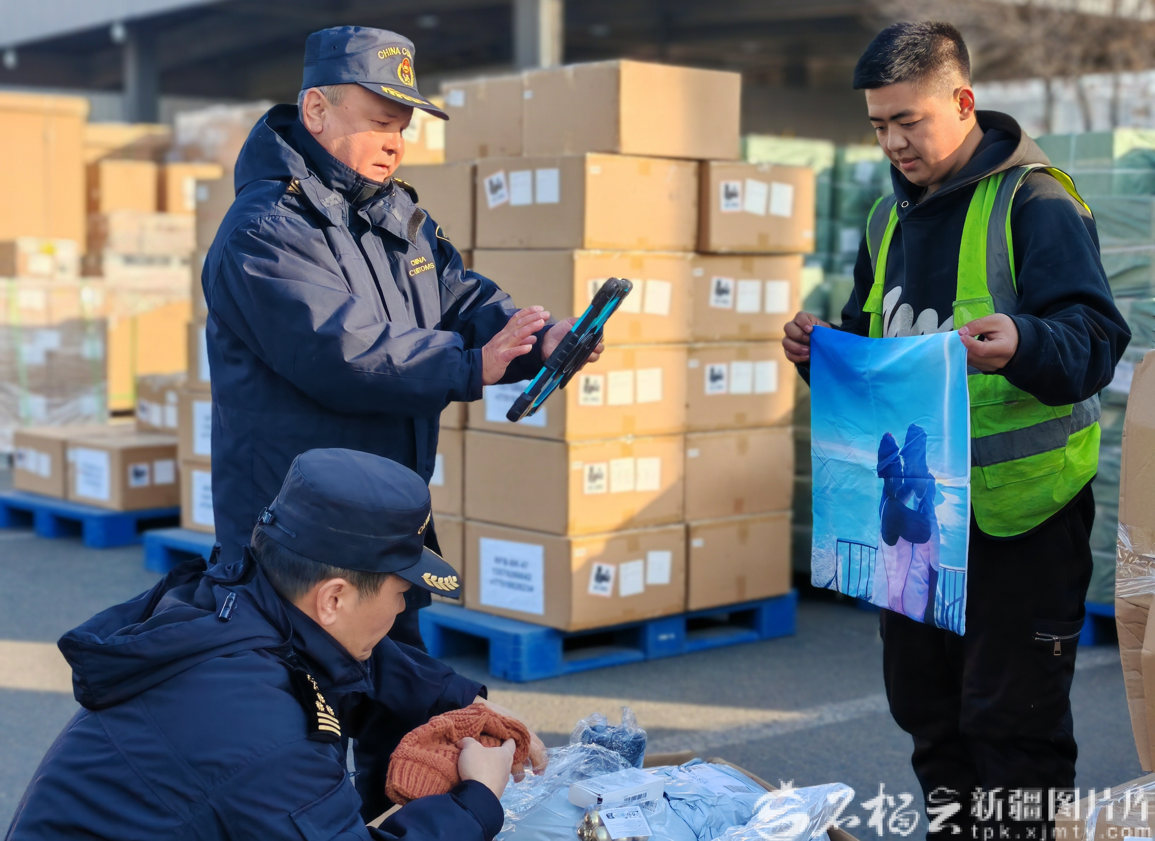 乌鲁木齐天山机场海关关员对一批出口货物进行监管。苟宝鹏摄