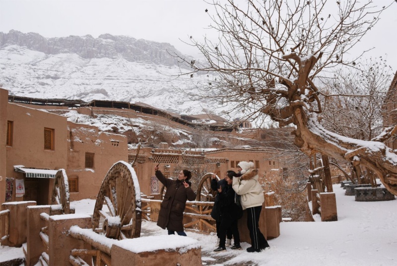 2025年12月11日,吐鲁番火焰山下,游客在落雪后的吐峪沟景区游玩。刘健 摄