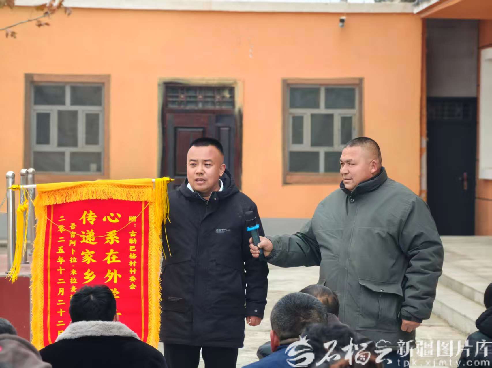 12月22日,在皮山县固玛镇古勒巴格村,伊卜拉伊木·吾吉阿卜拉的父亲(右)将他寄来的锦旗,送至村委会。阿布拉江·麦麦提敏 摄