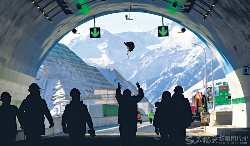 12月16日,乌尉高速公路通车前夕,收工后的施工人员将手中的安全帽抛向空中,尽情释放工程即将完工的喜悦。
