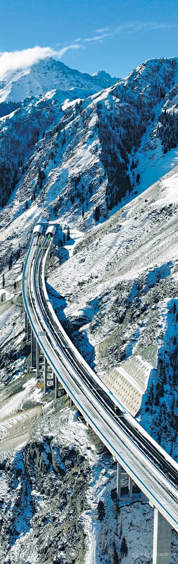 乌尉高速公路穿越天山山脉(12月22日无人机摄)。