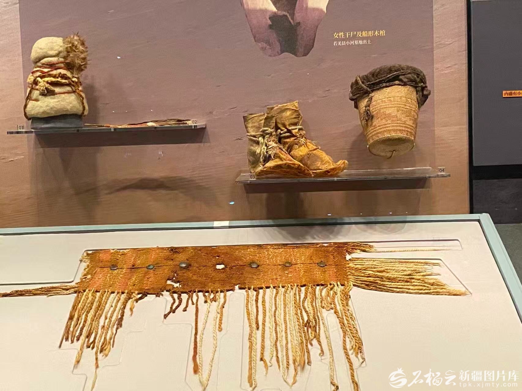 新疆博物馆陈列的小河墓地出土的毡帽、皮靴、腰衣和草编篓等随葬品。石榴云/新疆日报记者 赵梅摄