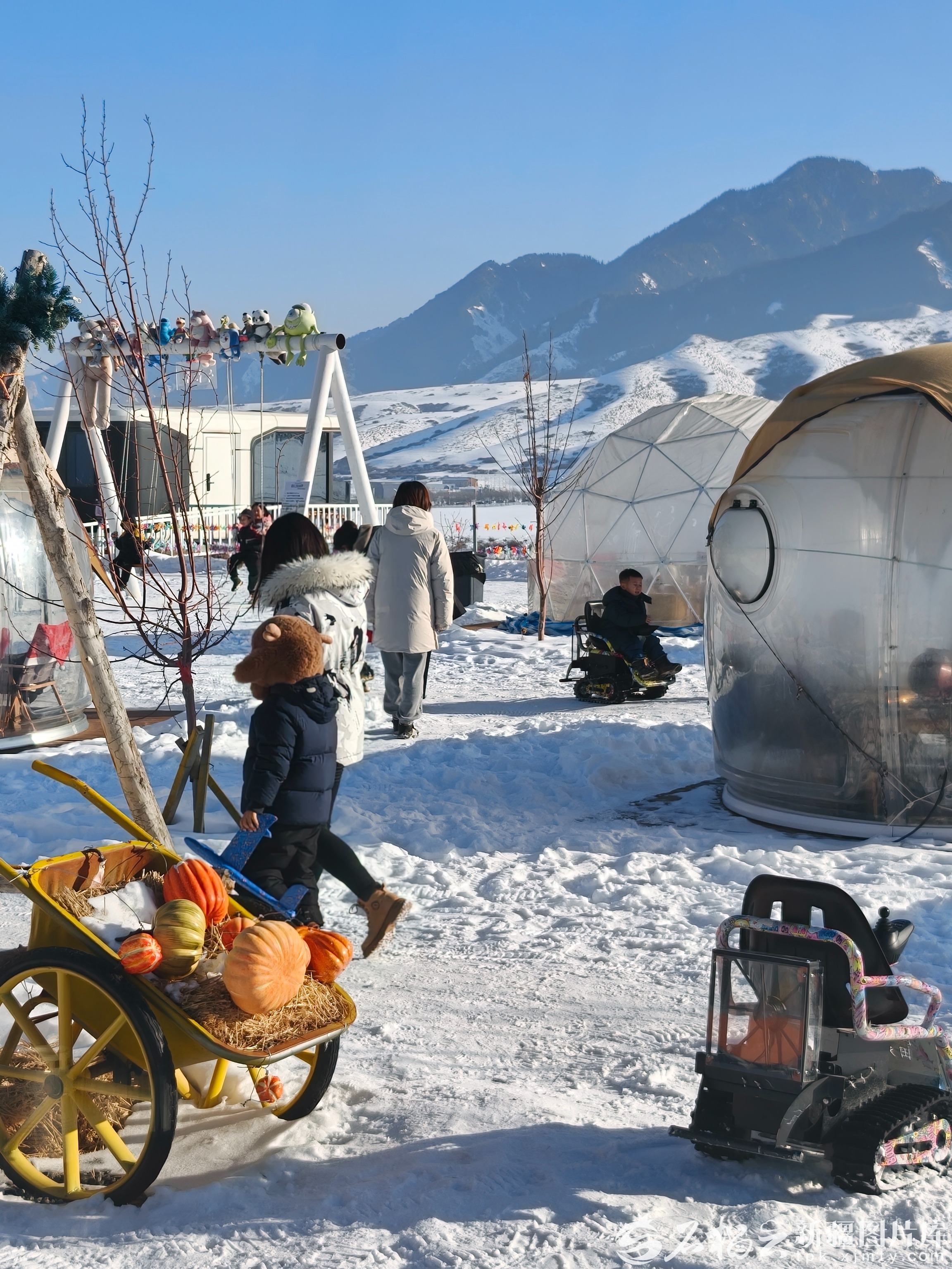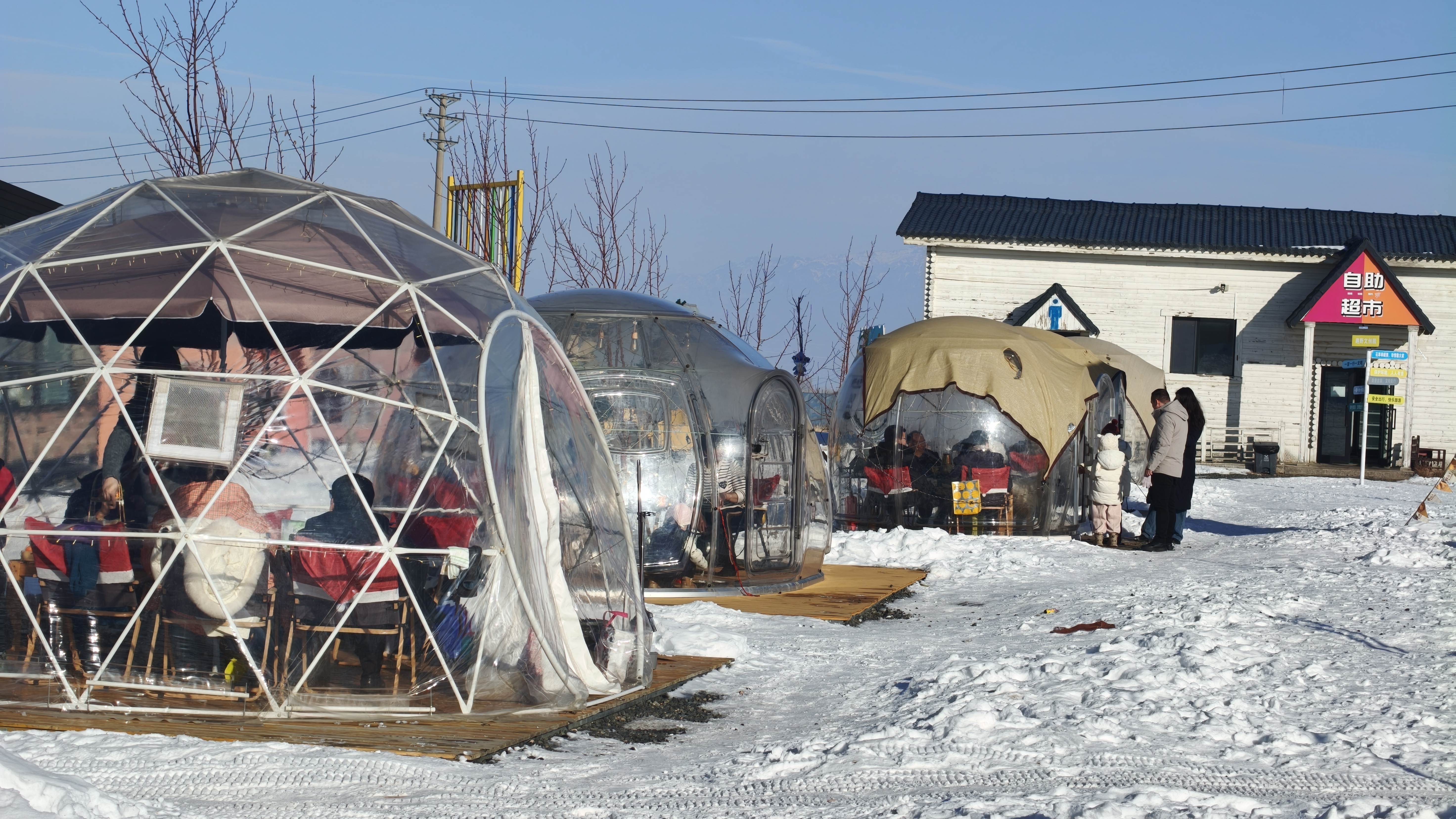 元旦上午11时左右,乌鲁木齐市南山的趣野文旅园,灿烂的阳光照在远处的雪峰、眼前的雪野之上,空气里混合着新煮的茶香和新年的喜气。已有三三两两游客在雪野和泡泡屋之间悠然漫步,享受冬日阳光了。