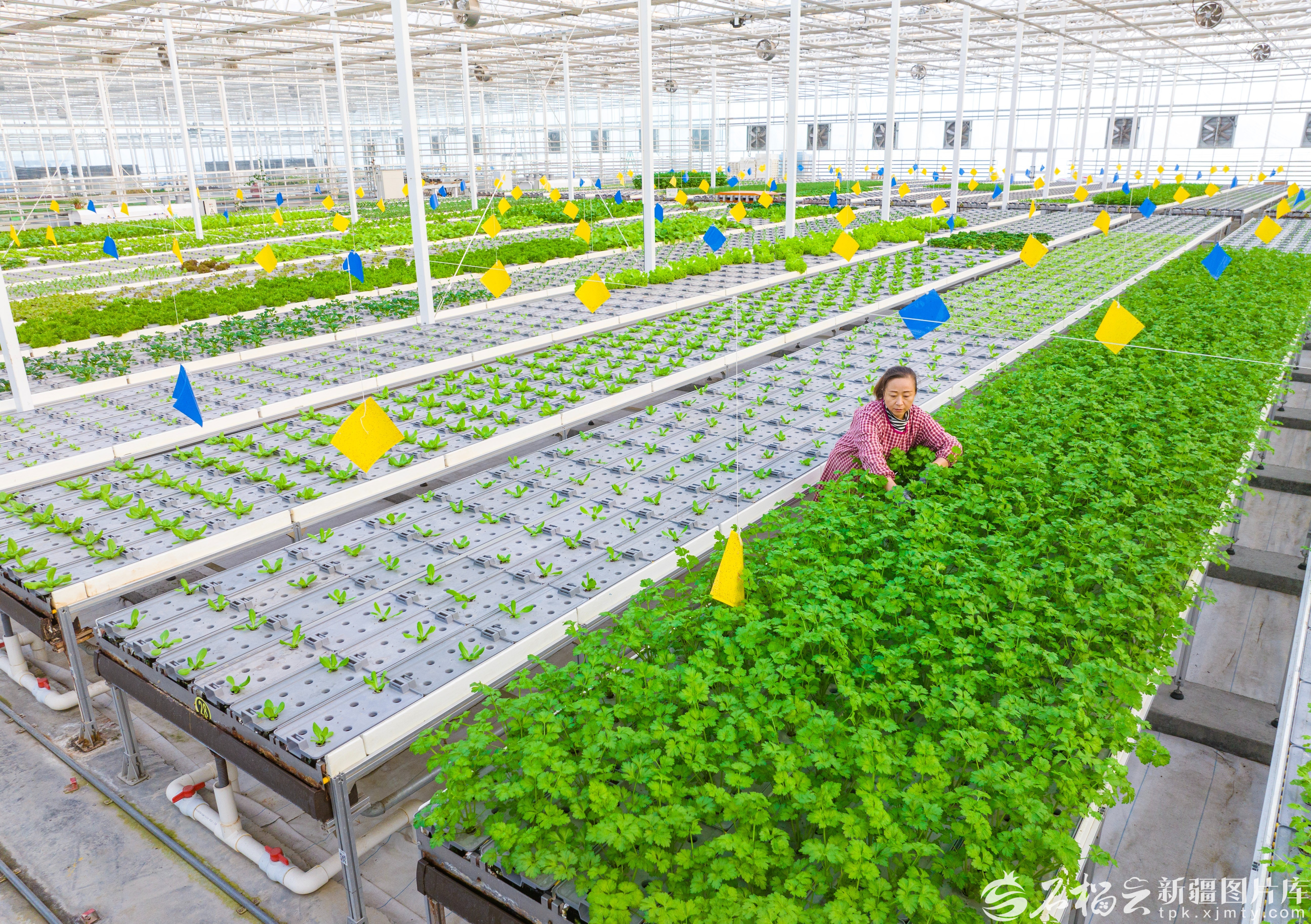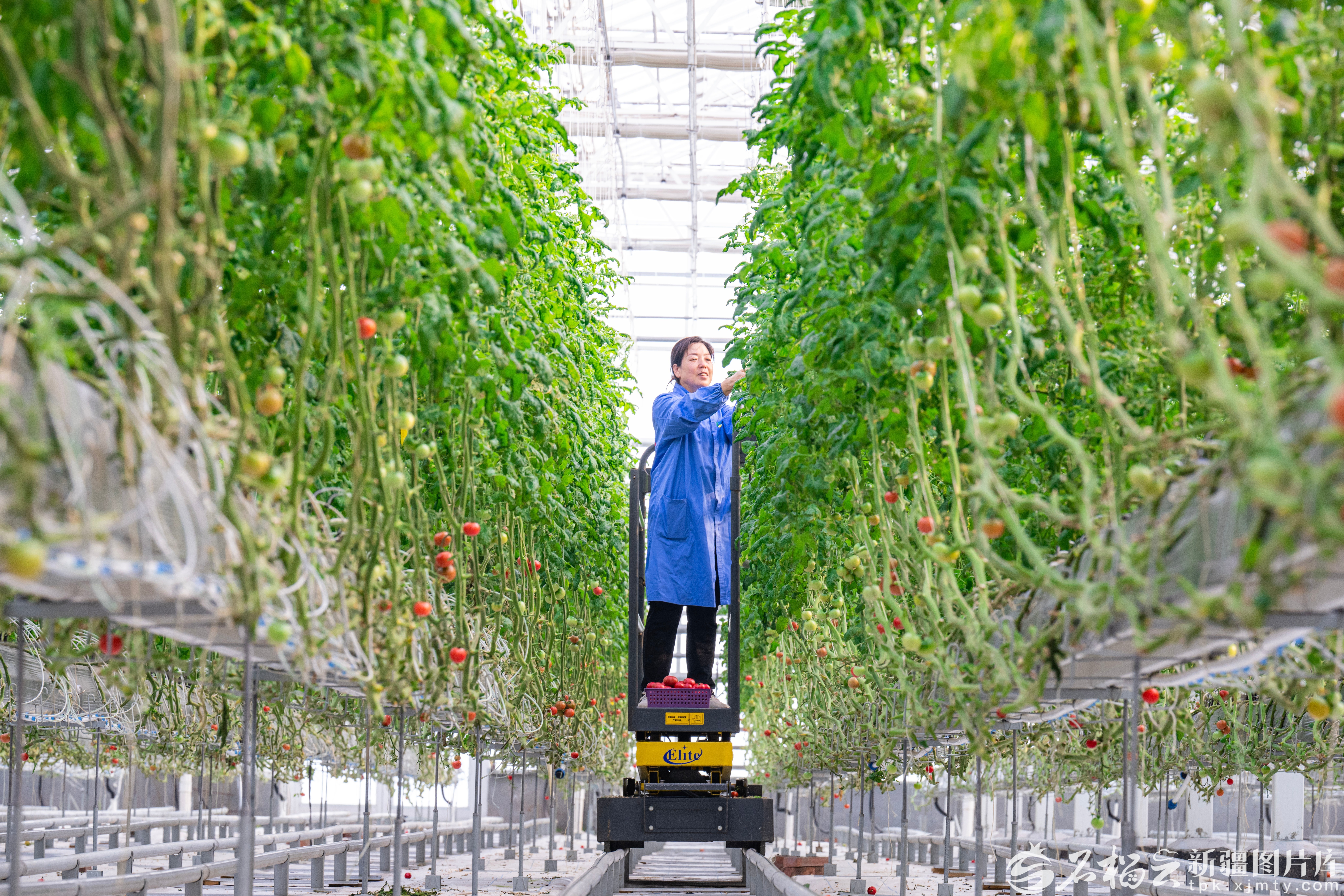 1月6日,工作人员在昌吉国家农业高新技术产业示范区新疆农业博览园智慧农业科技馆搬运无土栽培的西红柿。该馆集垂直农业、叶菜和果菜工厂于一体,应用5G物联网、仿生螺旋栽培等现代农业技术,实现蔬菜种植数字化。何龙摄