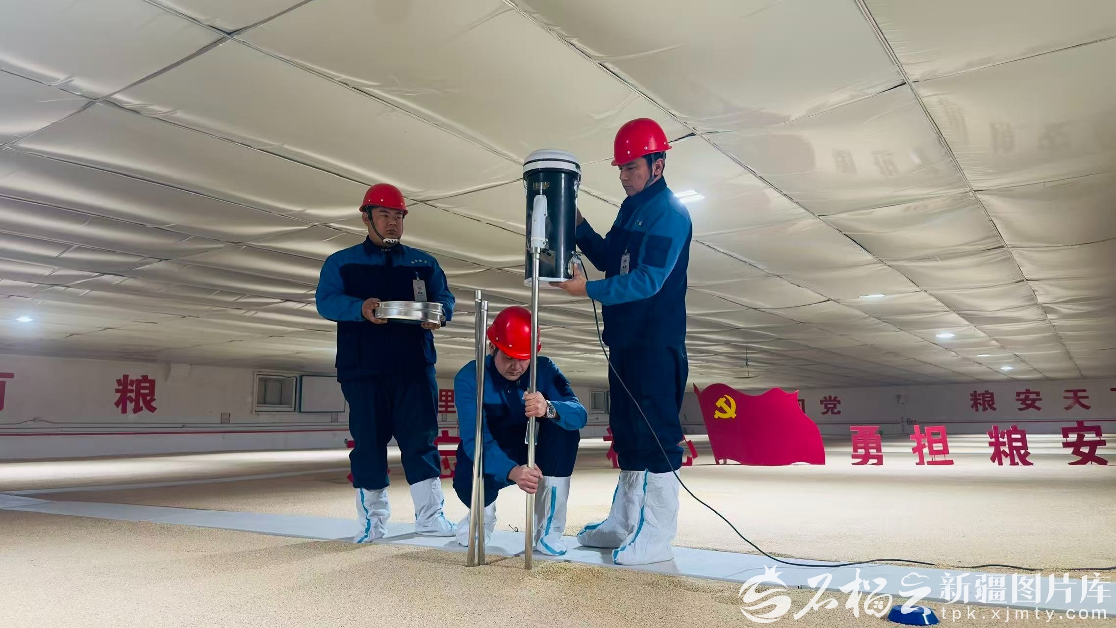 2025年12月初,新疆佳麦乐客粮食储备有限责任公司技术人员在检查储备粮粮情。图/新疆佳麦乐客粮食储备有限责任公司提供