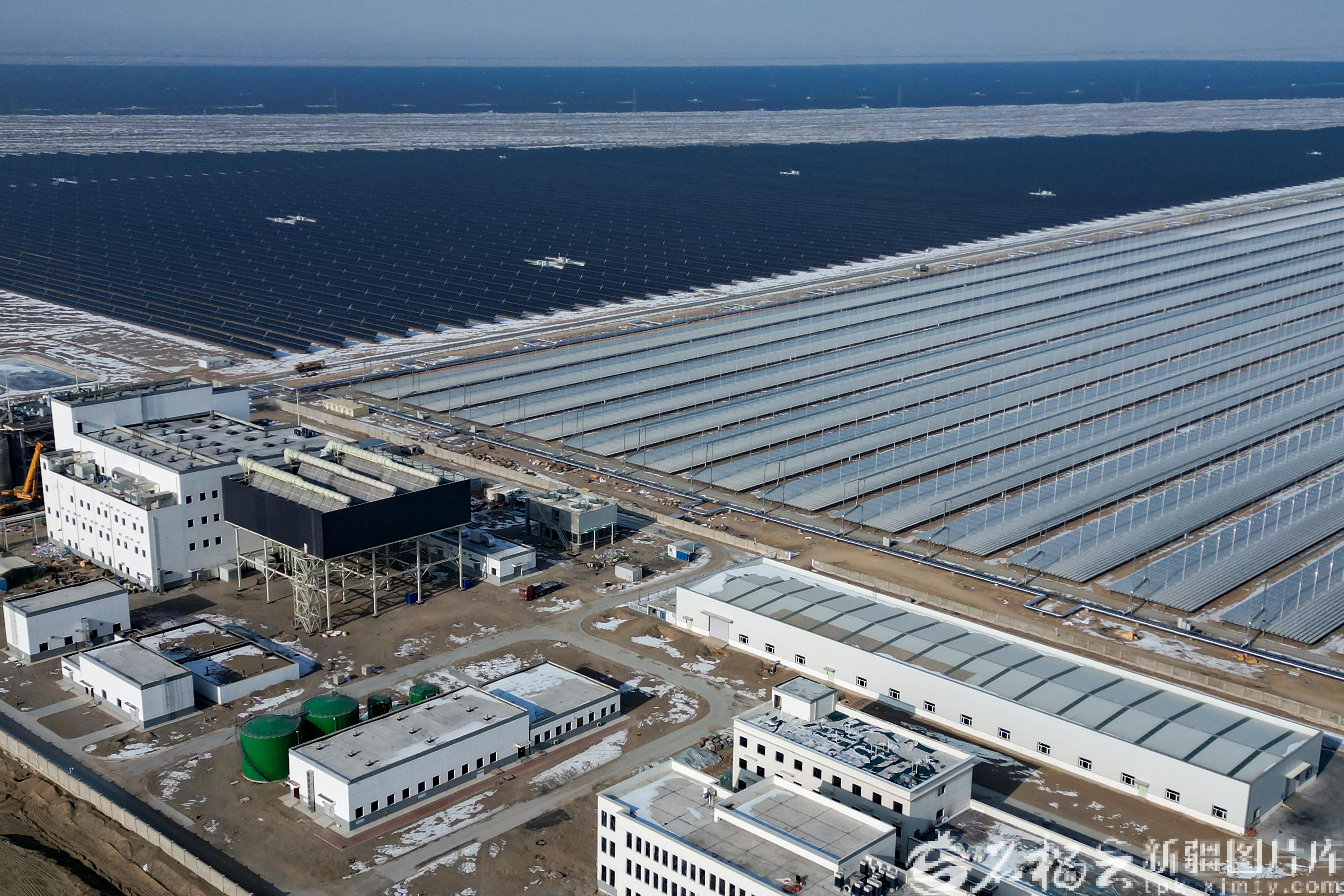 1月12日,在哈密市伊州区北部拍摄的大唐石城子100万千瓦“光热+光伏”一体化清洁能源示范项目一角(无人机摄)。