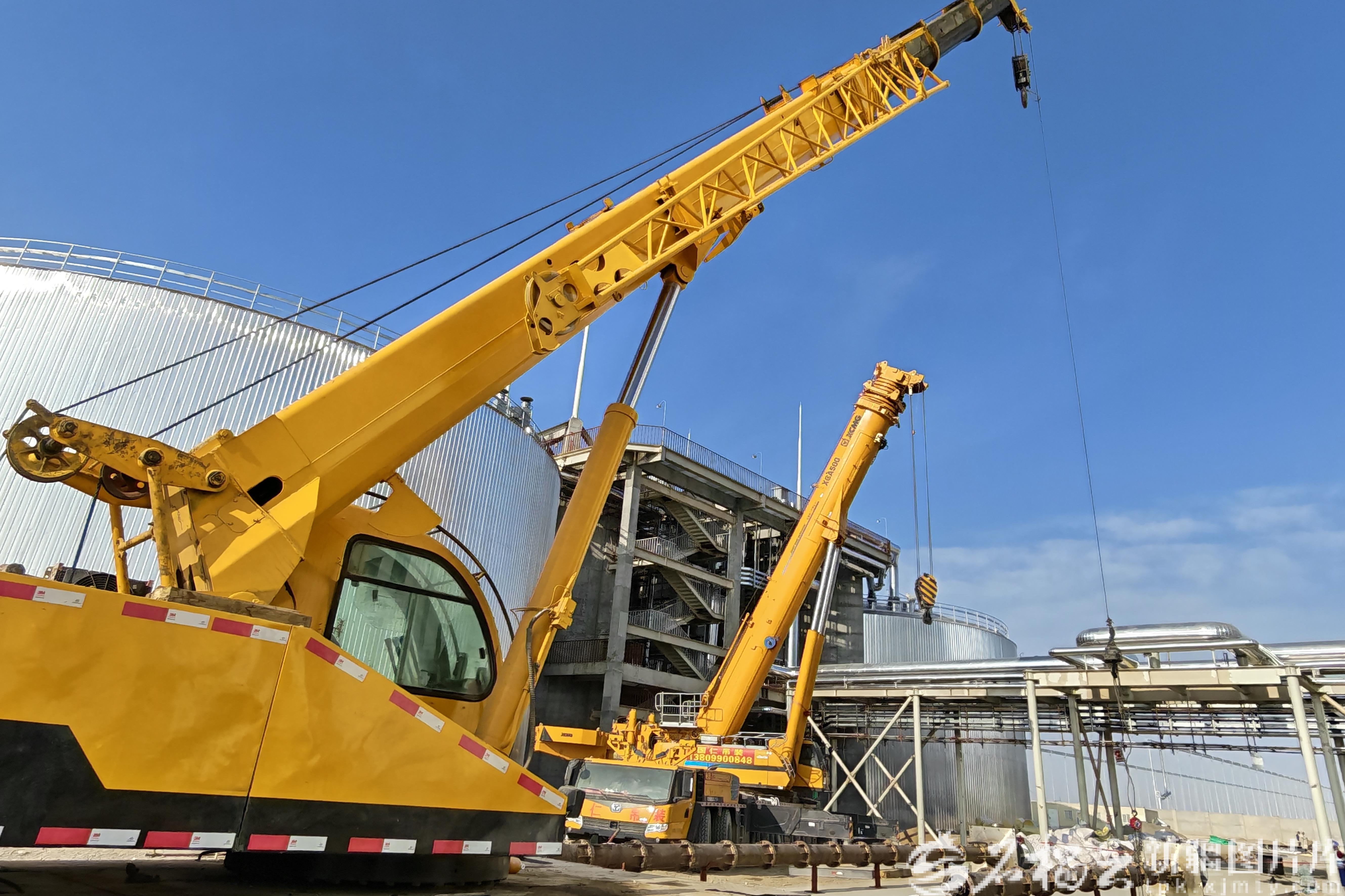 1月12日,吊车在位于哈密市伊州区北部的大唐石城子100万千瓦“光热+光伏”一体化清洁能源示范项目现场吊装设备。