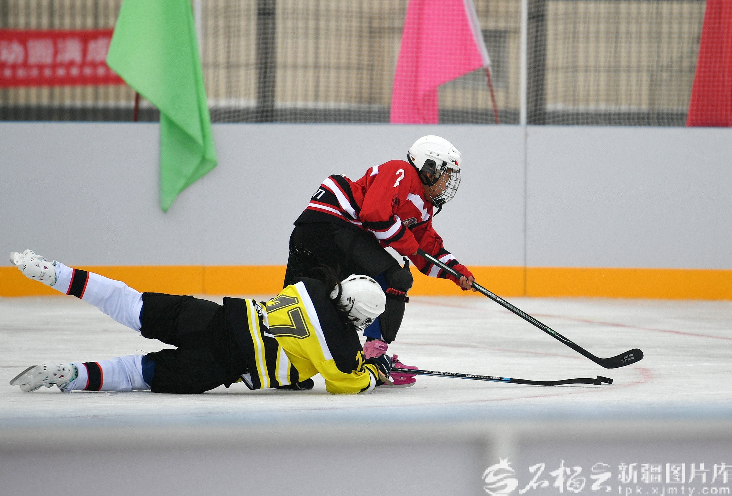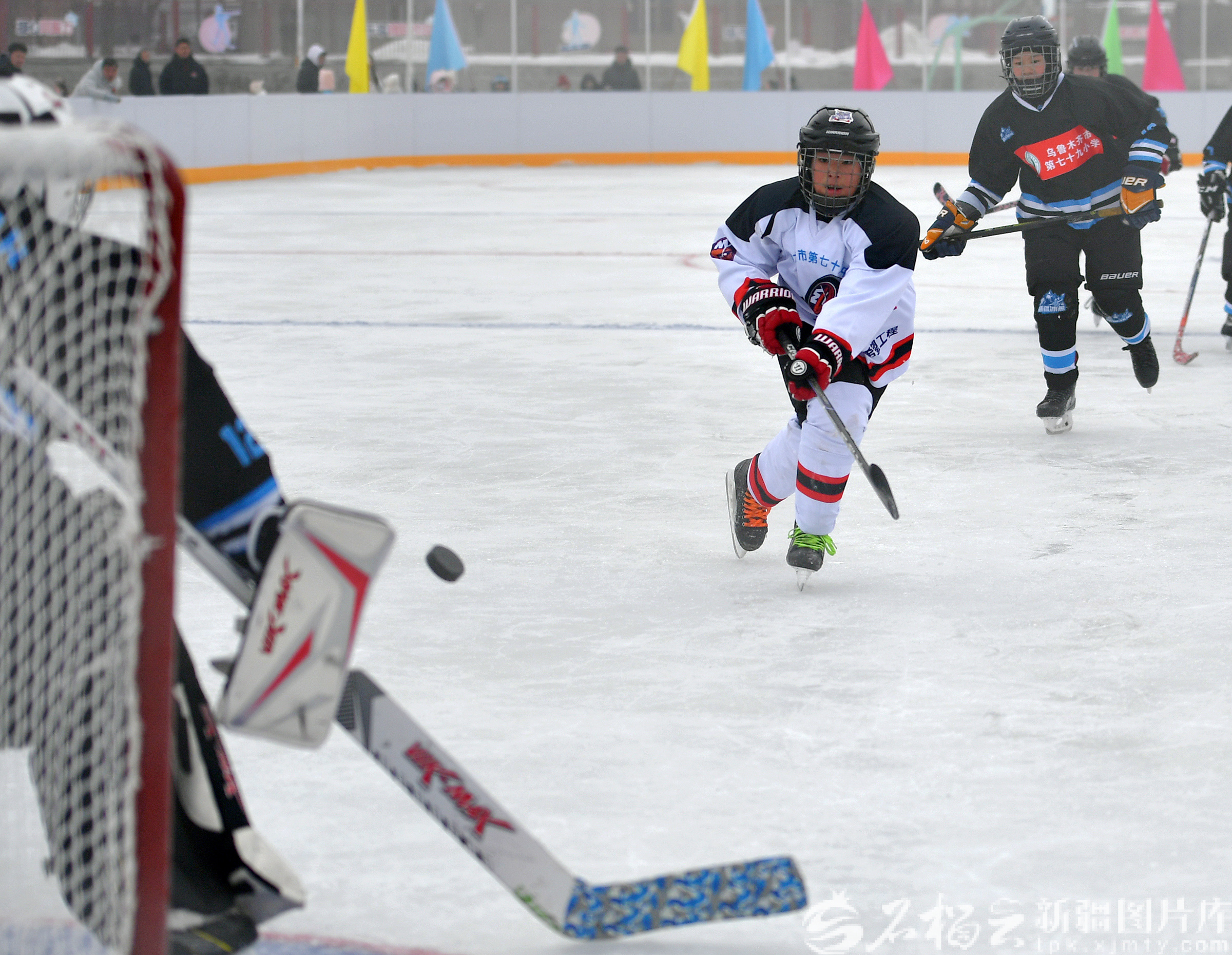 1月14日,来自乌鲁木齐市第76中学的参赛选手在冰球比赛中射门。