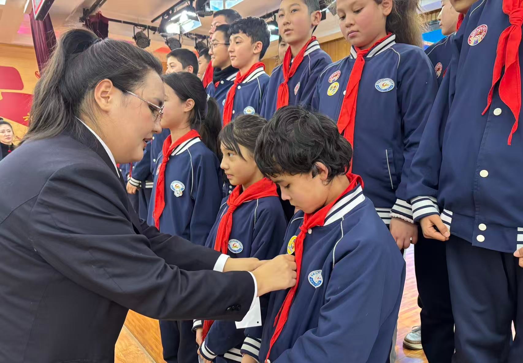 乌鲁木齐市天山区人民检察院检察官为学生佩戴“普法小先锋”标志。受访单位供图