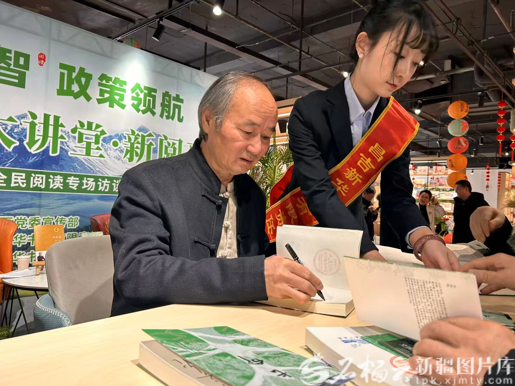 1月20日,“文润天山大讲堂·新阅惠”刘亮程全民阅读专场访谈现场,刘亮程为读者签名。记者阿比拜摄