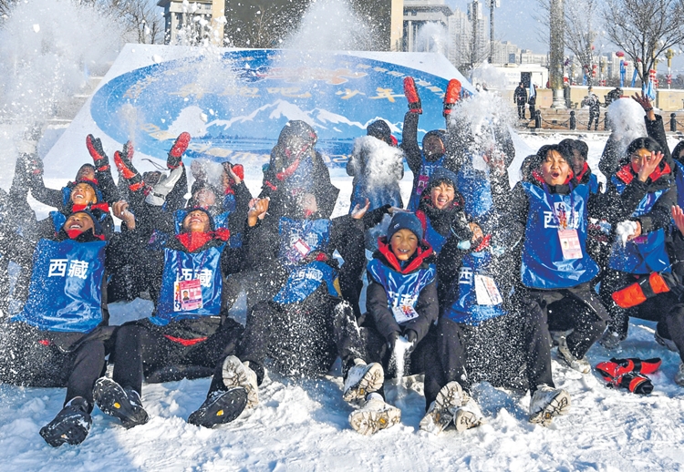 1月30日,乌鲁木齐市南湖市民广场,参加2026年“奔跑吧·少年”全国青少年冬季阳光体育大会的小运动员们戏雪畅玩。石榴云/新疆日报记者 周鹏摄