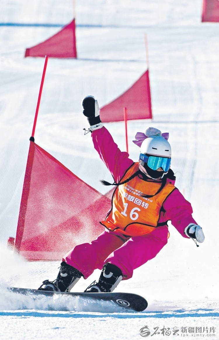 1月31日,丝绸之路山地度假区滑雪场,运动员参加单板滑雪回转项目比赛。石榴云/新疆日报记者 周鹏摄