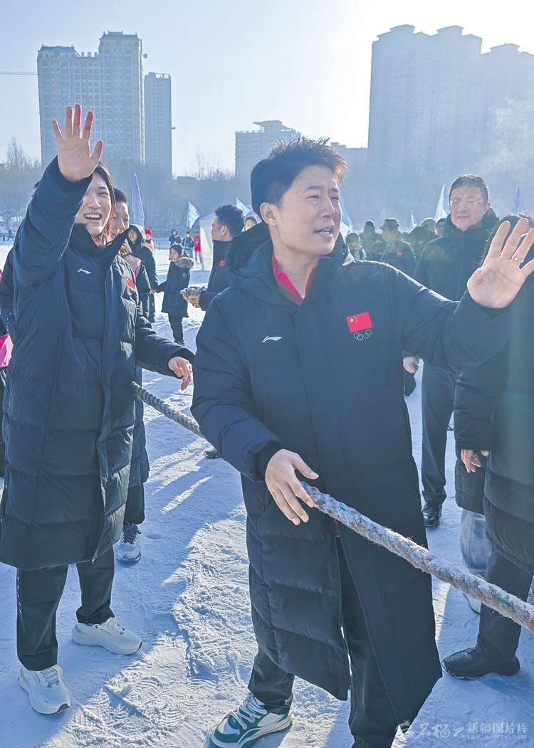 1月30日,2026年“奔跑吧·少年”全国青少年冬季阳光体育大会“玩冰乐雪”体验活动在乌鲁木齐市南湖市民广场举行。奥运会游泳冠军汪顺和新疆队小运动员一起参加冰上龙舟项目比赛。石榴云/新疆日报记者 张新军摄