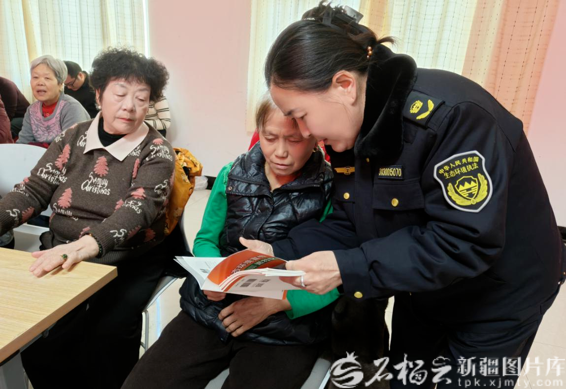 1月22日,塔城地区生态环境局裕民分局工作人员在社区开展生态宣讲时给居民讲解环保知识。焦琳摄