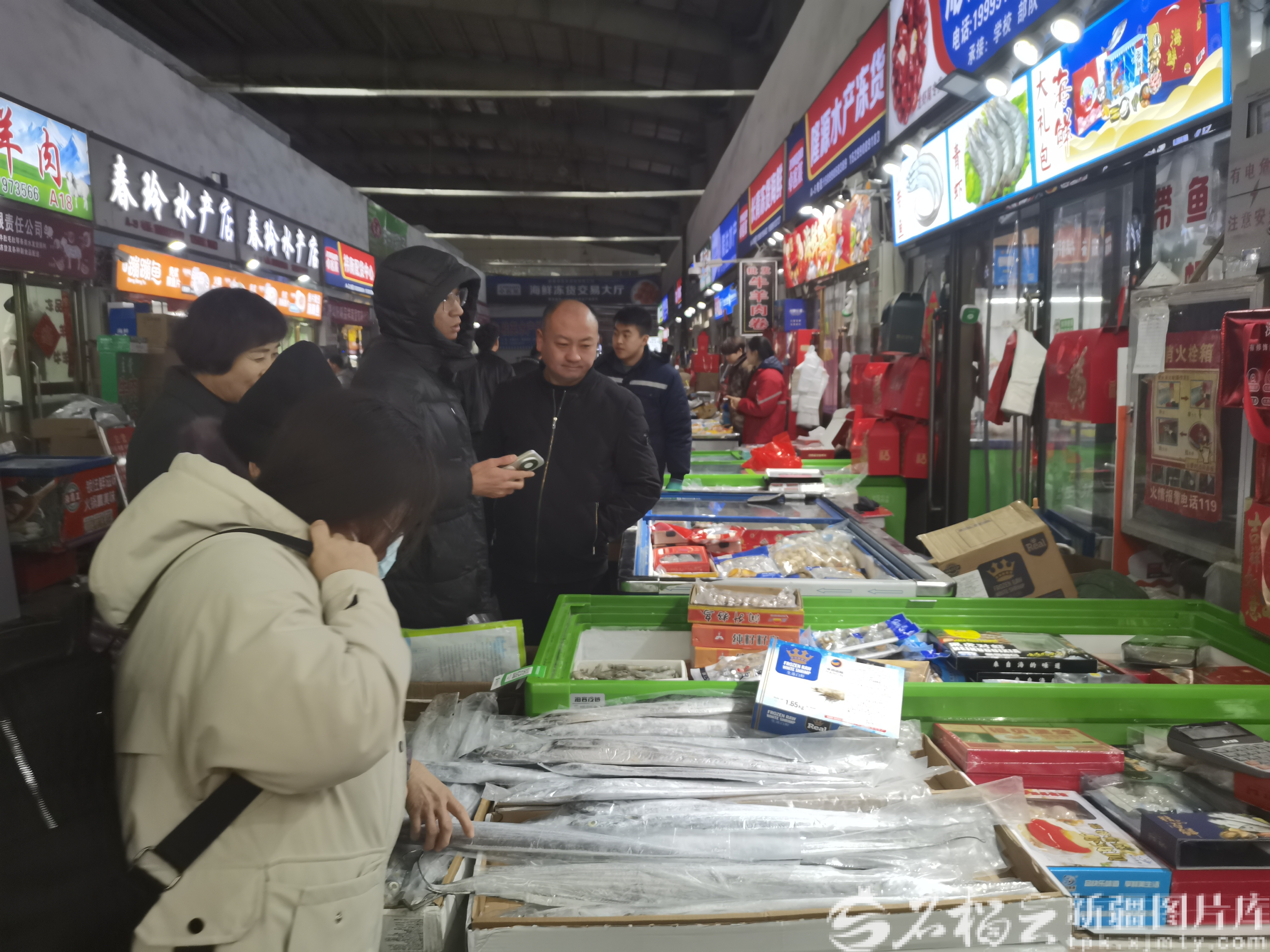 就在这时,在新北园春市场海鲜专区,经营鑫源水产冻货店的付瑞娟和丈夫也来到了市场。他们打开店铺门,将装满冻虾、鱼丸等的冰柜搬到门口,又将一箱箱带鱼、黄花鱼、多宝鱼、鱿鱼等海鲜冻货码放在店铺门口,方便顾客挑选。做完这些后,付瑞娟夫妇立即开始为订货的餐馆备货。“这是固定客户订的货,有90多公斤,要提前准备好。”付瑞娟一边说一边将分拣的冻货装进几个大包。之后,伴随着市场内熙熙攘攘的人群,订货的客户来到店铺,提走了夫妇俩备好的各类冻货。