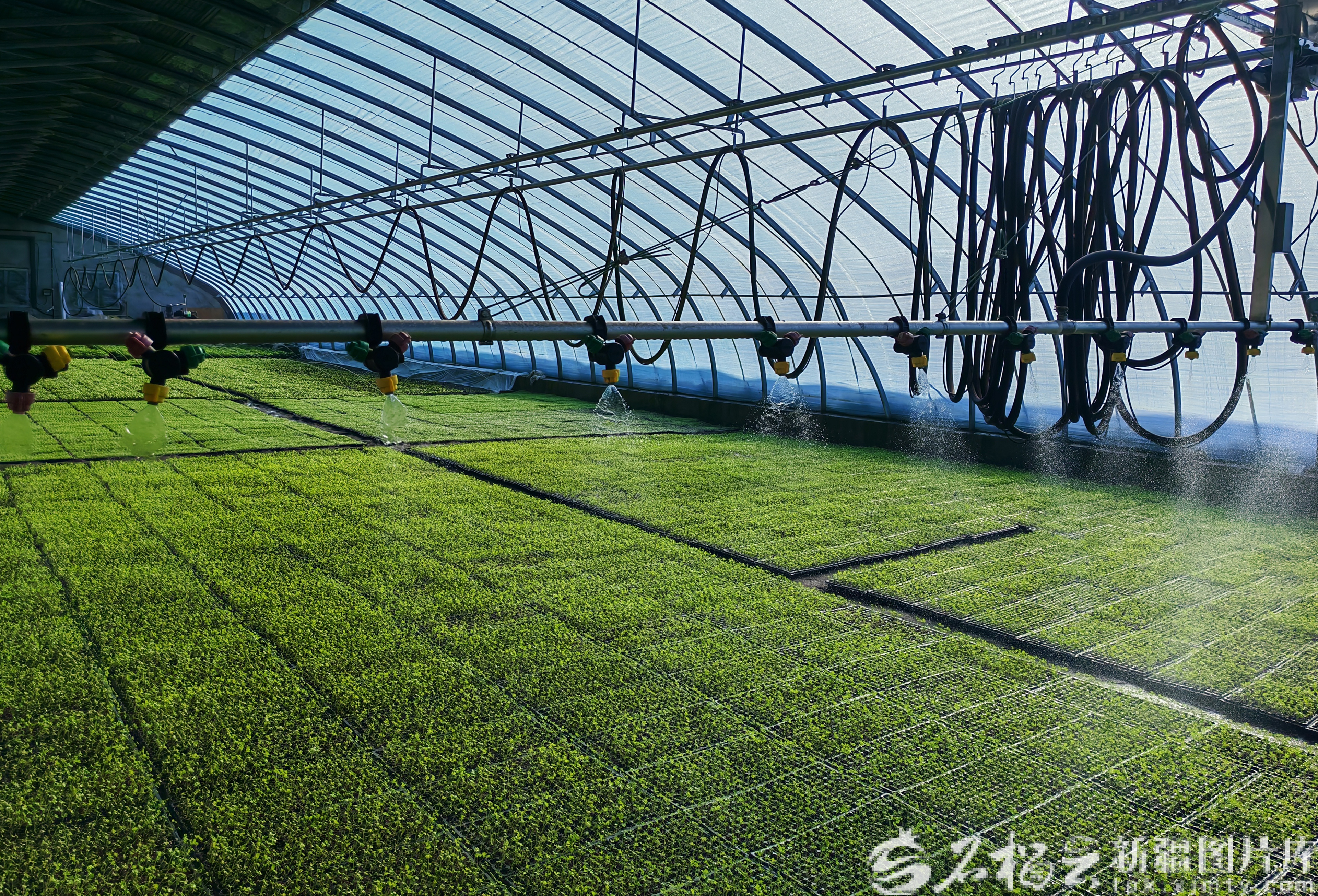 2月12日,在乌鲁木齐高新区(新市区)青格达湖乡新联村的清洁能源智能温室里,智能喷淋设备在给幼苗灌溉。