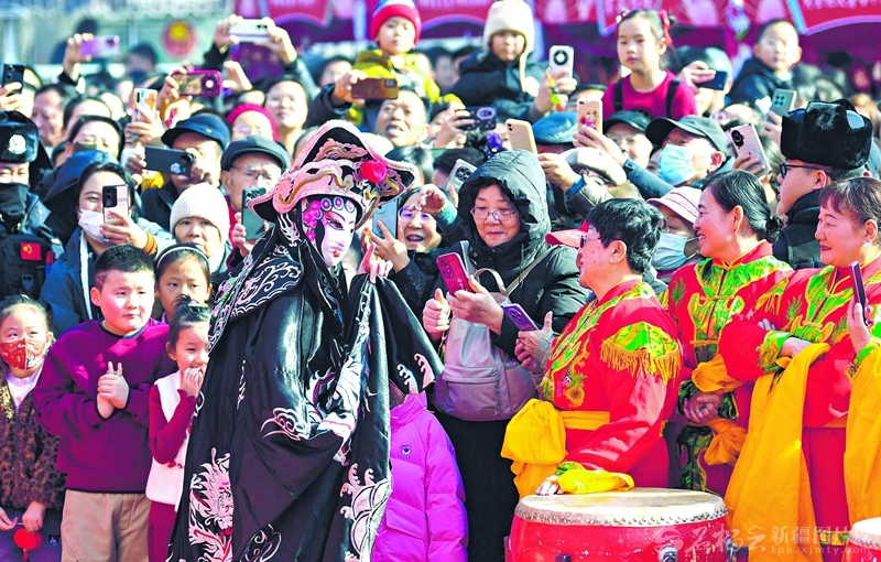 2月18日,川剧变脸演员与群众互动。2月17日,乌鲁木齐市红山公园第九届新春庙会启幕,这场集民俗、美食、娱乐、文化于一体的盛宴,让年味在烟火气中升腾。天山网-新疆日报记者汤永摄