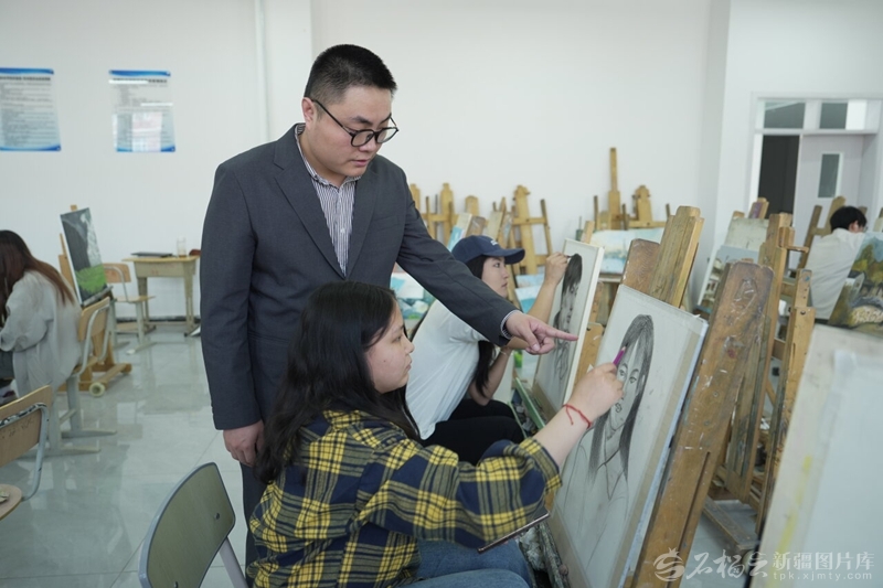 在新疆和田学院艺术学院,安徽大学援疆教师郭延龙为美术教育2024级学生进行素描课程教学指导(2025年10月15日摄)。卢瑛摄
