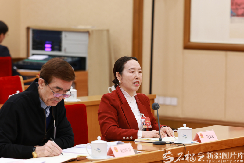 3月8日,十四届全国人大四次会议新疆代表团举行小组会议,分别审议生态环境法典草案、民族团结进步促进法草案、国家发展规划法草案。图为吴文秀代表(右)围绕建设美丽乡村等内容发言。记者 崔志坚摄