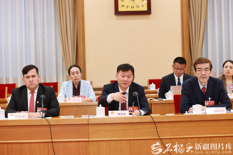 3月8日,十四届全国人大四次会议新疆代表团举行小组会议,分别审议生态环境法典草案、民族团结进步促进法草案、国家发展规划法草案。图为刘洪涛代表(前中)围绕推进发展规划法治化等内容发言。记者 崔志坚摄