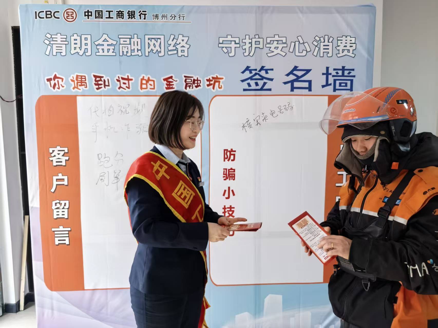 工行员工在外卖站点向外卖员宣讲金融知识。