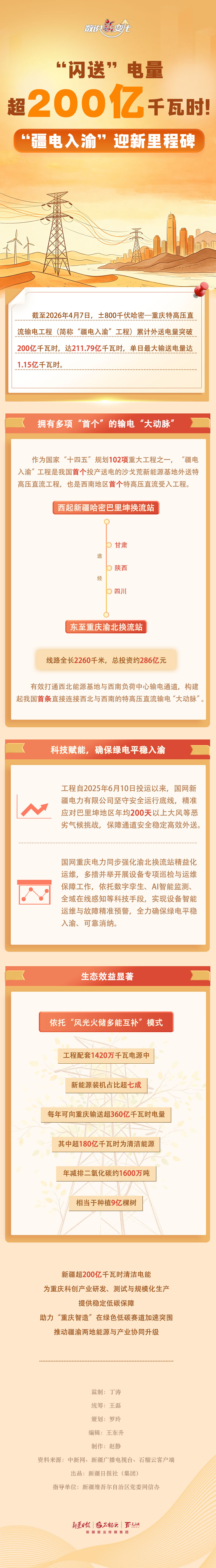截至2026年4月7日,“疆电入渝”工程累计外送电量已突破200亿千瓦时,达到211.79亿千瓦时。其中,单日最大输送电量达1.15亿千瓦时,展现出强劲的输电能力。这一工程不仅有力推动了跨区域能源资源的优化配置,也为西南地区的绿色低碳转型与高质量发展提供了坚实的电力保障。本期《数说“新”变化》带您一同关注。