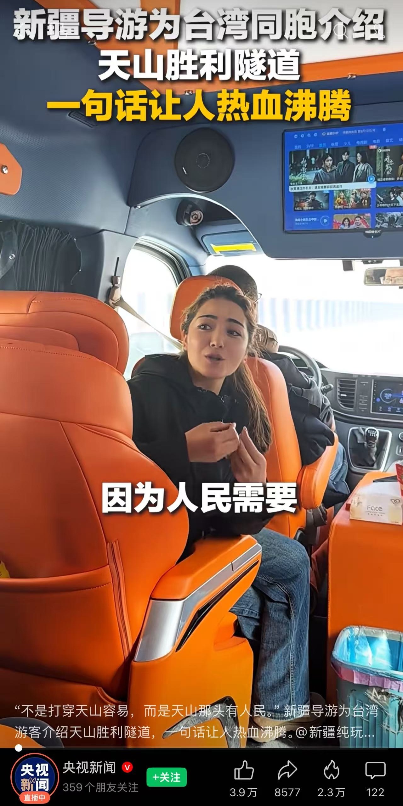镜头里,一名年轻导游坐在大巴前排,车辆正行驶在世界最长的高速公路隧道——天山胜利隧道里。她拿起麦克风,面向台湾游客说了一番话,很快冲上热搜,并被央视新闻视频号等转发,无数网友被这句话点燃——