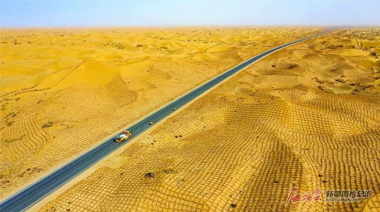 10月13日,在尉犁至且末沙漠公路K034段,施工人员正在进行道路标线作业。眼下,该公路施工已进入收尾阶段。 李飞 摄