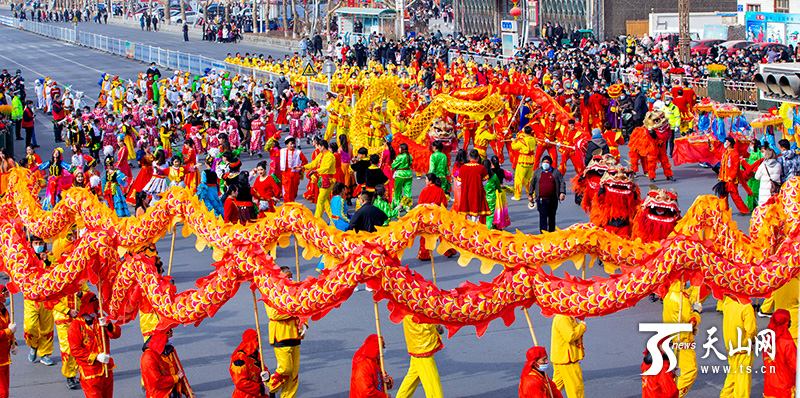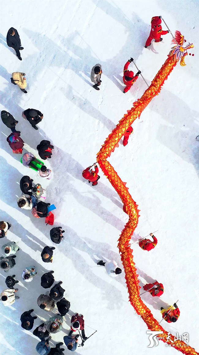 2月4日,游客在博湖县博斯腾湖大河口景区观看舞龙表演。春节假期,博湖县开展“迎冬奥冰雪游”系列活动,舞龙舞狮、社火表演、观冰雕等丰富多彩的文体活动,吸引了众多游客前来品味年俗,乐享假日时光。确·胡热摄