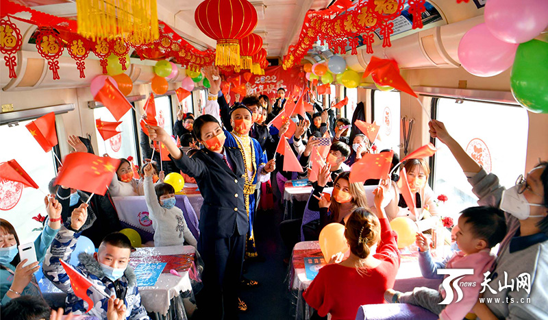 1月31日,旅客和乘务员在列车上齐唱《歌唱祖国》。1月31日,T9526次“民族团结一家亲号”特快旅客列车乘务员和旅客共同举办列车“春晚”,欢欢喜喜过大年。天山网/新疆日报记者邹懿摄