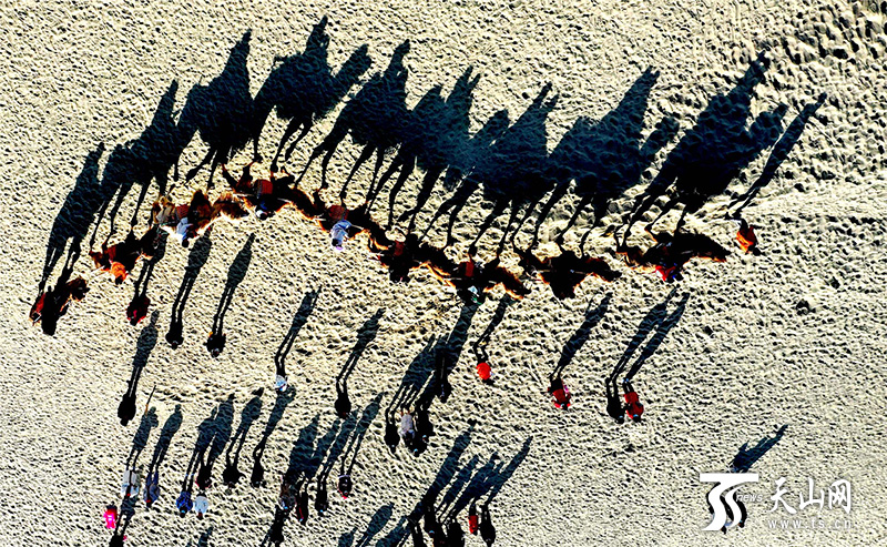 2月2日,游客在沙漠之门景区骑骆驼游玩(无人机拍摄)。沙漠之门景区位于塔克拉玛干沙漠北缘阿拉尔市11团,春节期间,该景区推出骆驼骑行、冰雪游玩旅游项目,吸引游客前来观光游玩,尽享假日欢乐。王志清摄