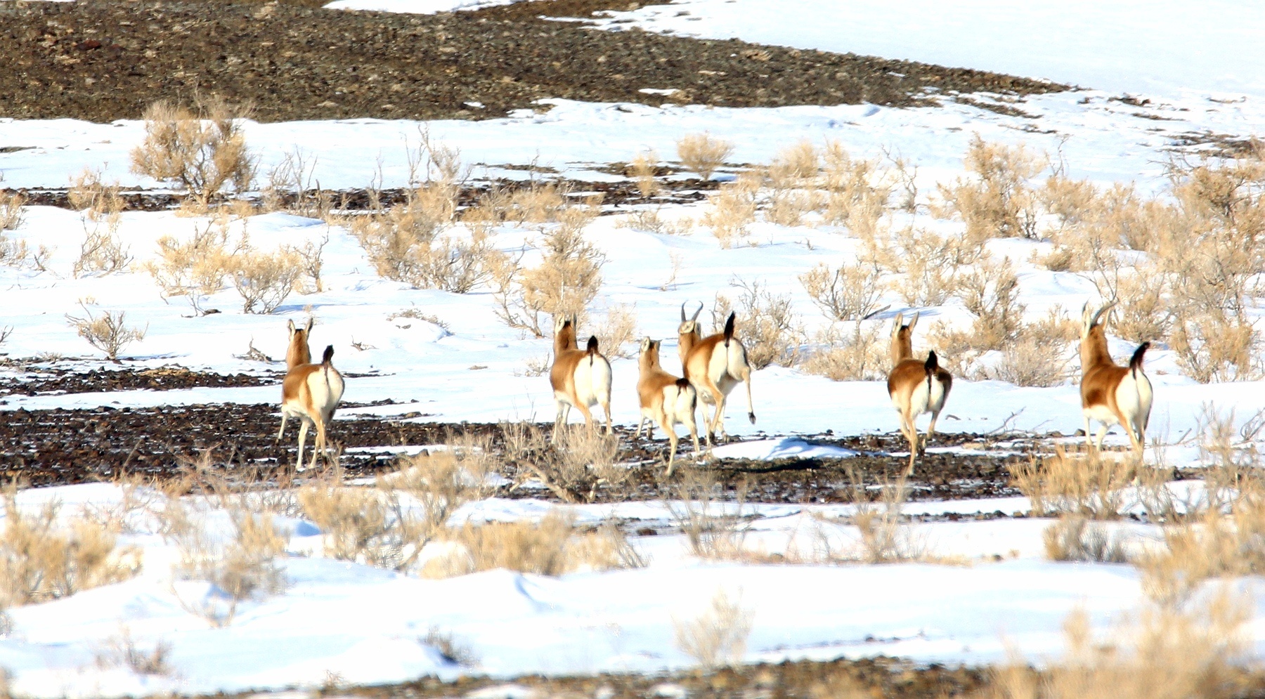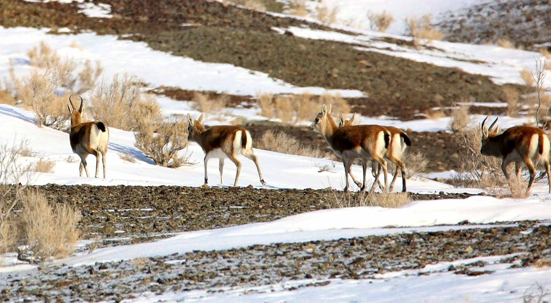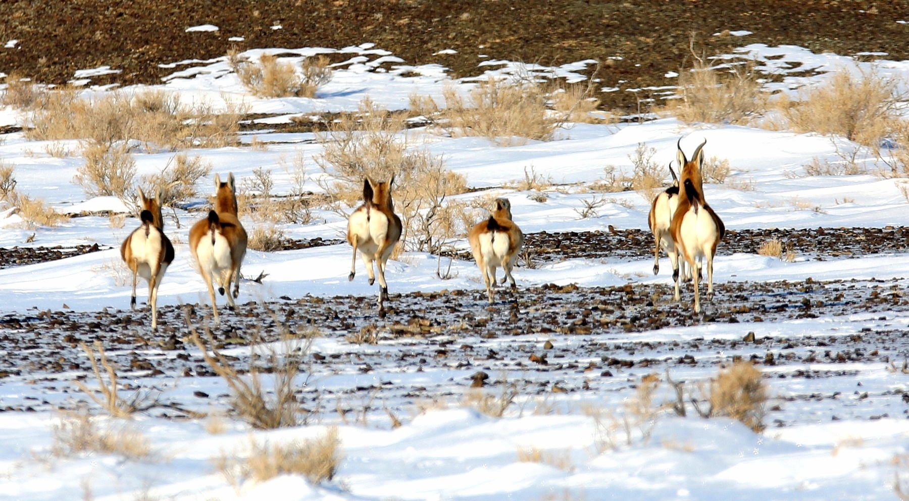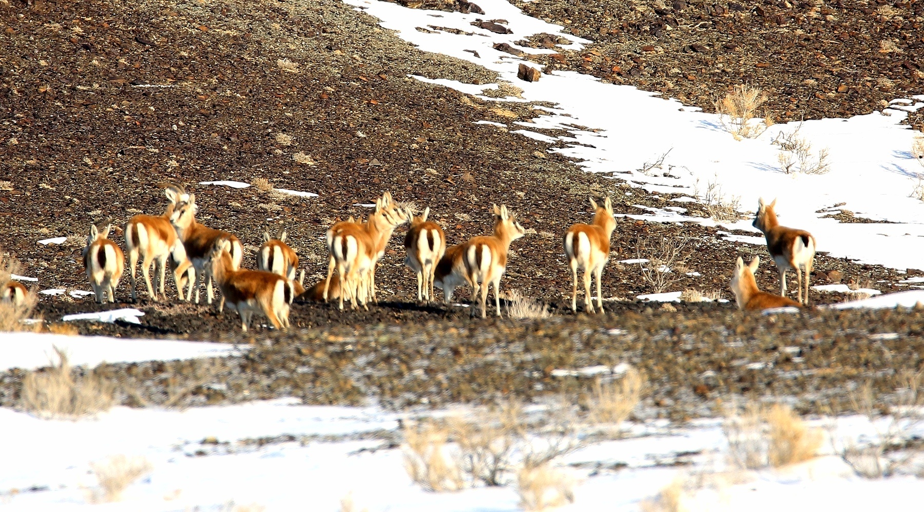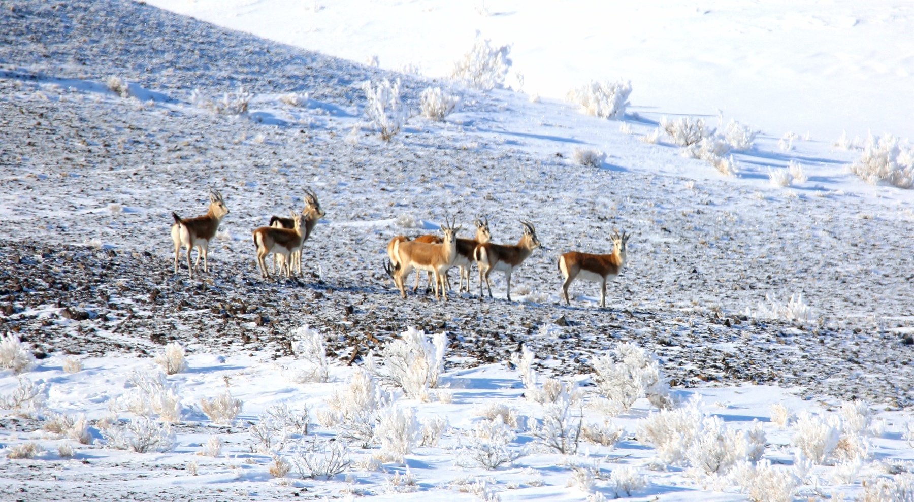 1月1日,在新疆昌吉回族自治州木垒哈萨克自治县东北部的戈壁雪原上,成群的鹅喉羚在悠闲觅食,它们或驻足凝望,或嬉戏奔跑,身姿矫健、体态轻盈,成为冬季大漠戈壁一道亮丽的风景线。