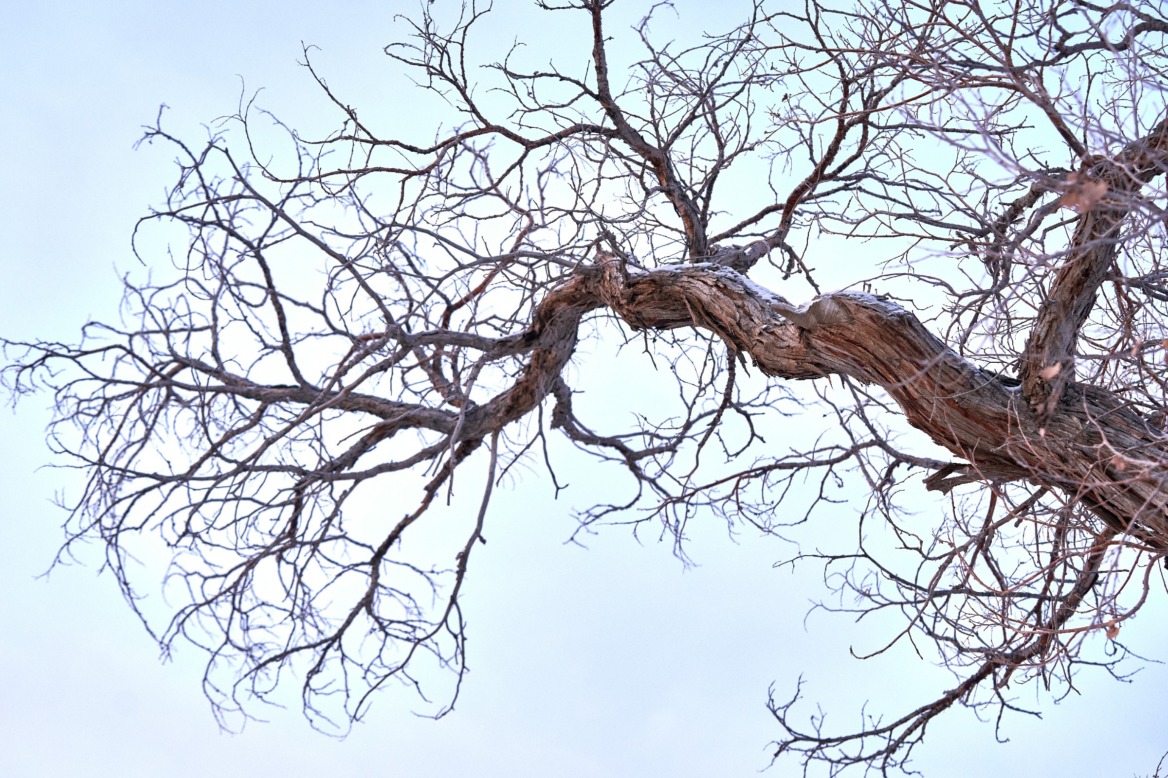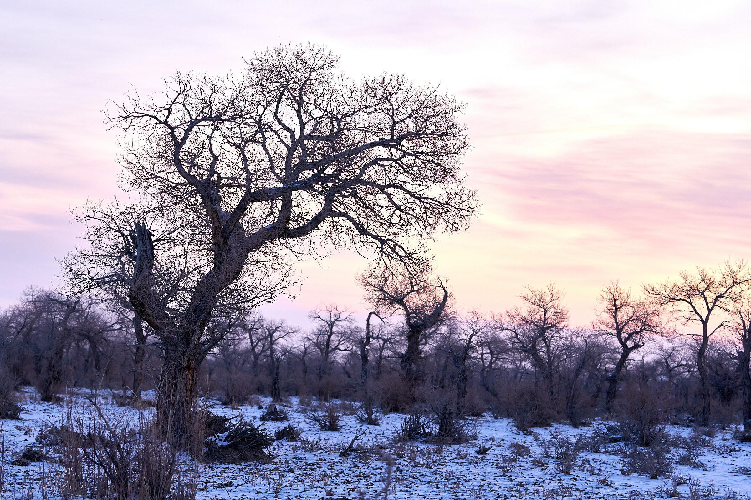 2月12日,在新疆塔城地区托里县白杨河林场,沐浴在晨光中的胡杨林美不胜收。天边一抹绯红朝霞,朝阳顺着天际缓缓升起,穿透苍劲虬枝,为远处的胡杨镀上一层温柔的金边。胡杨的枝干或遒劲挺拔,或蜿蜒如弓,皲裂的树皮镌刻着岁月的痕迹,光秃的枝丫在澄澈的天空下肆意舒展,仿佛在与晨光对话。