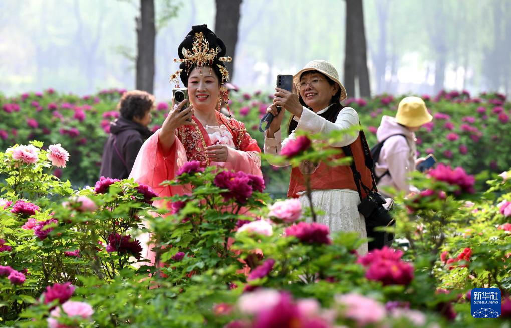 4月15日,游客在河北省石家庄市植物园内牡丹园赏花拍照。新华社发(陈其保摄)