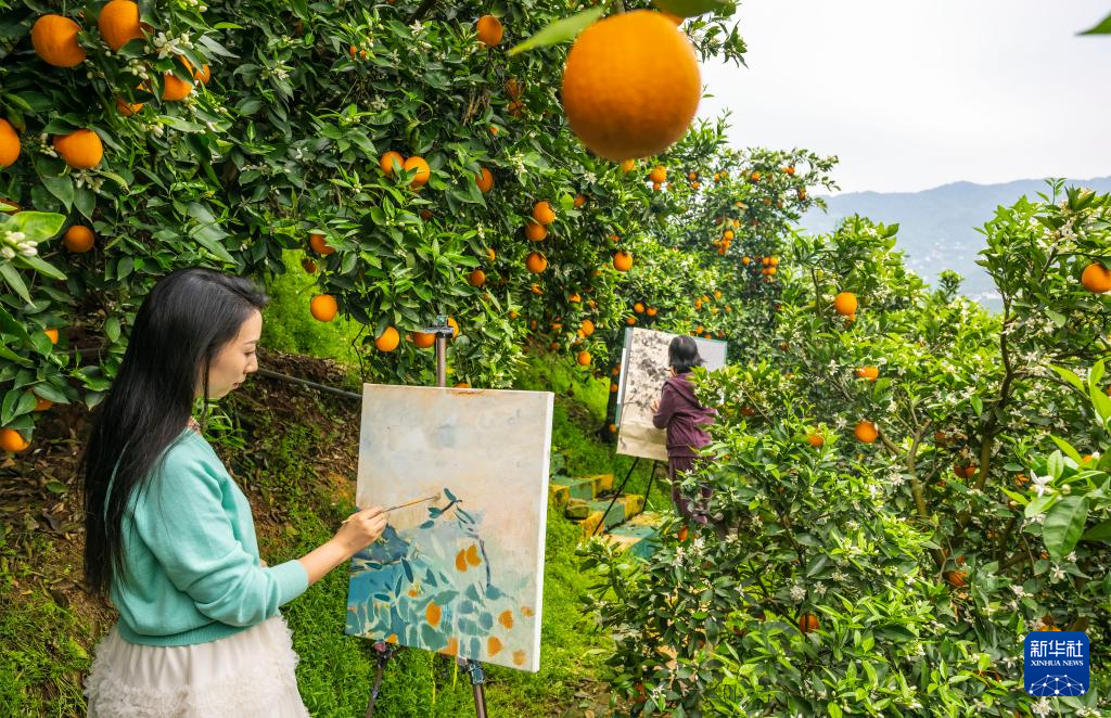 4月15日,人们在湖北省秭归县水田坝乡龙口村橘园里写生。新华社发(郑家裕摄)
