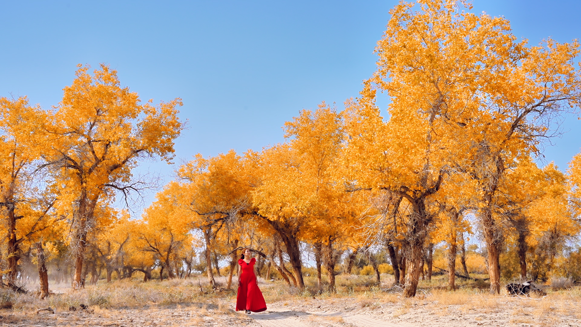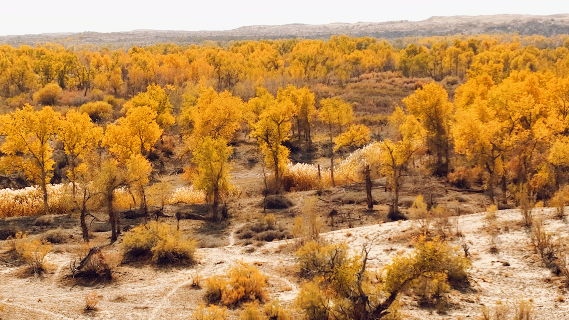 胡杨林金色的枝叶染秋,沙地为底,尽显苍凉壮美。
