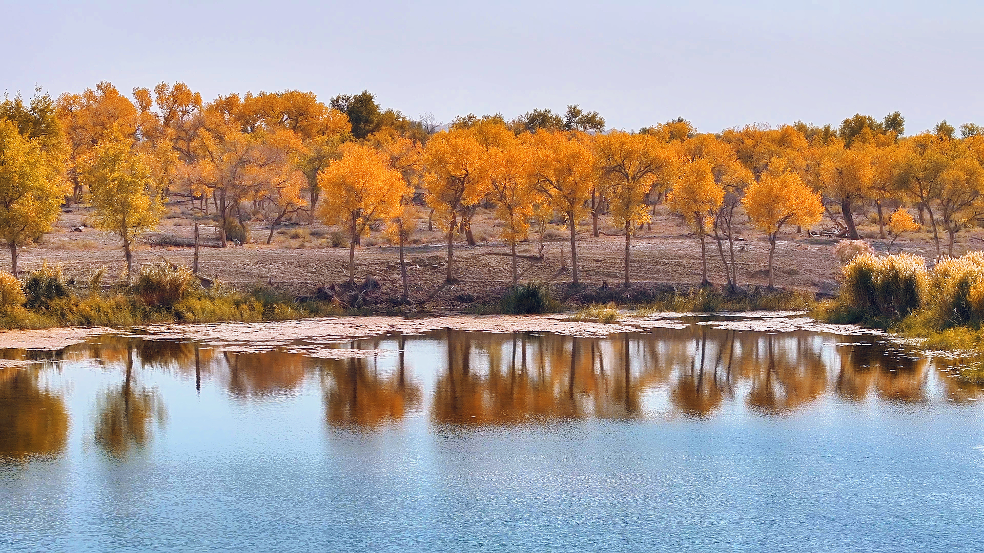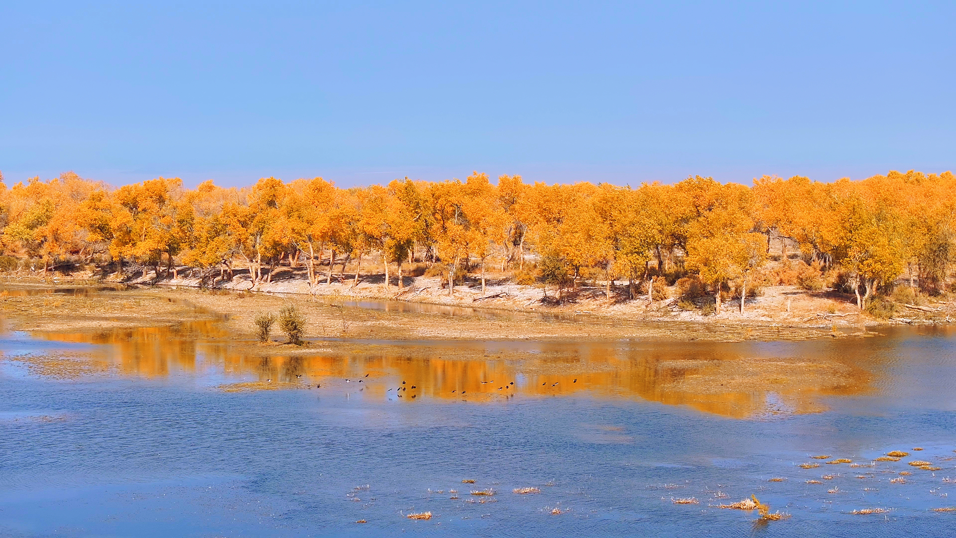 湖畔胡杨林,金黄树叶倒映水中,静谧诗意。