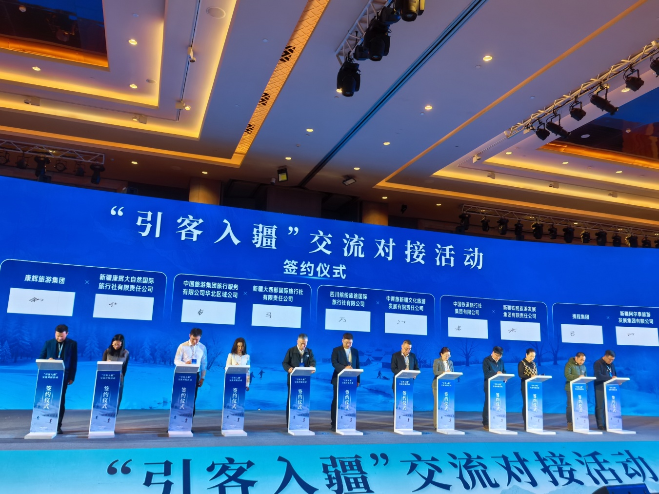 交流对接活动当日,现场进行了自治区和兵团的旅游资源和旅游产品推介、旅游惠民政策发布,国铁集团介绍了铁路援疆举措。此外多家旅行社和文旅企业还进行了现场签约,共同为冬季的“引客入疆”作出积极贡献。此外,吉林等多个省区市也现场推介了各自的冬季文旅项目。