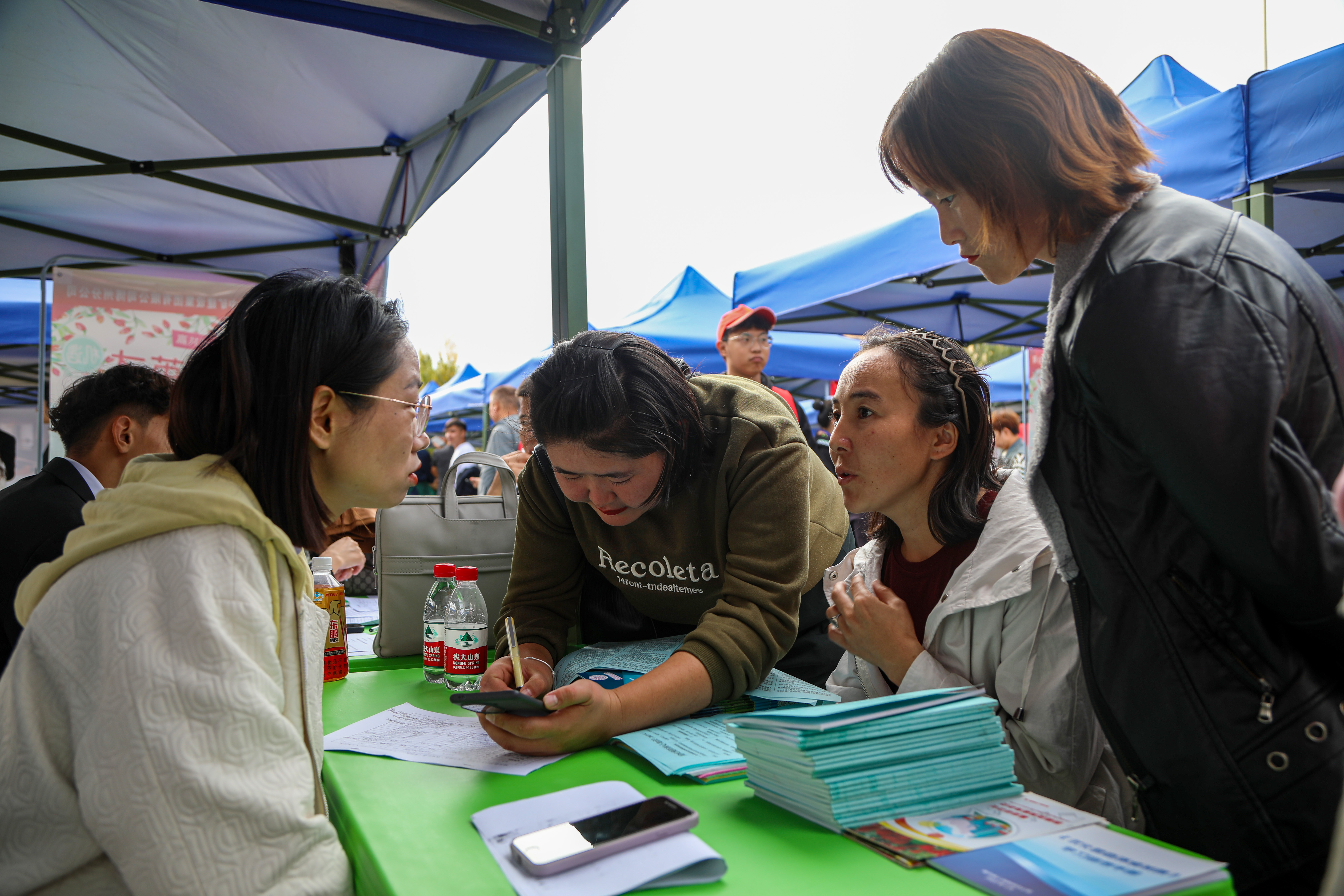 9月25日,自治区“四方助农”农业行业(乡村振兴)专项招聘活动启动仪式在博尔塔拉蒙古自治州精河县举办。图为招聘会现场求职者和用人单位双向交流。张戈摄