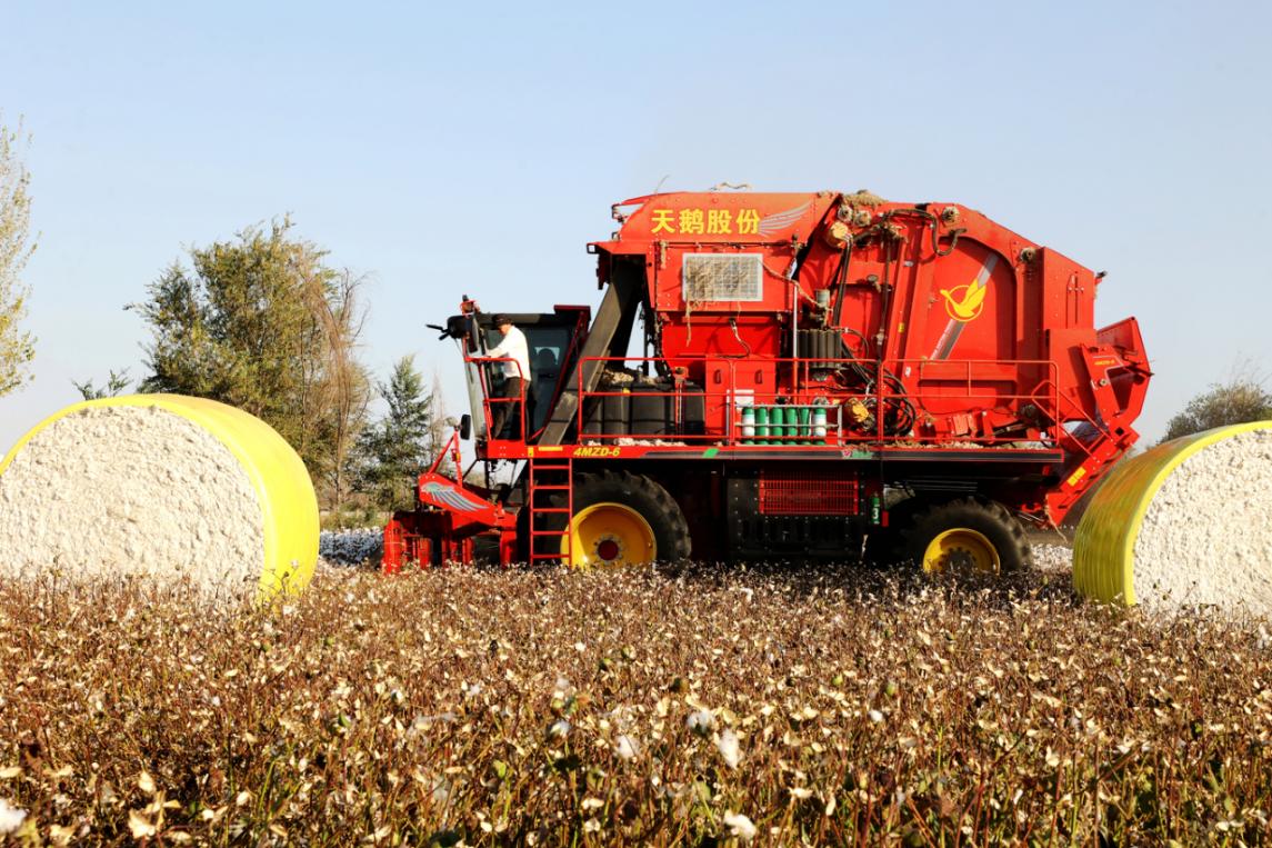 在昌吉市榆树沟镇,今年7.5万亩棉田迎来采收期。走进该镇前进村的棉田,一眼望去,雪白的棉絮在阳光下格外醒目,大型采棉机穿梭其间,伴随着轰鸣声完成采摘、收集作业,随即,1个重达2吨左右的“大金蛋”从采棉机滚落地面,机械化采收的忙碌景象扑面而来。